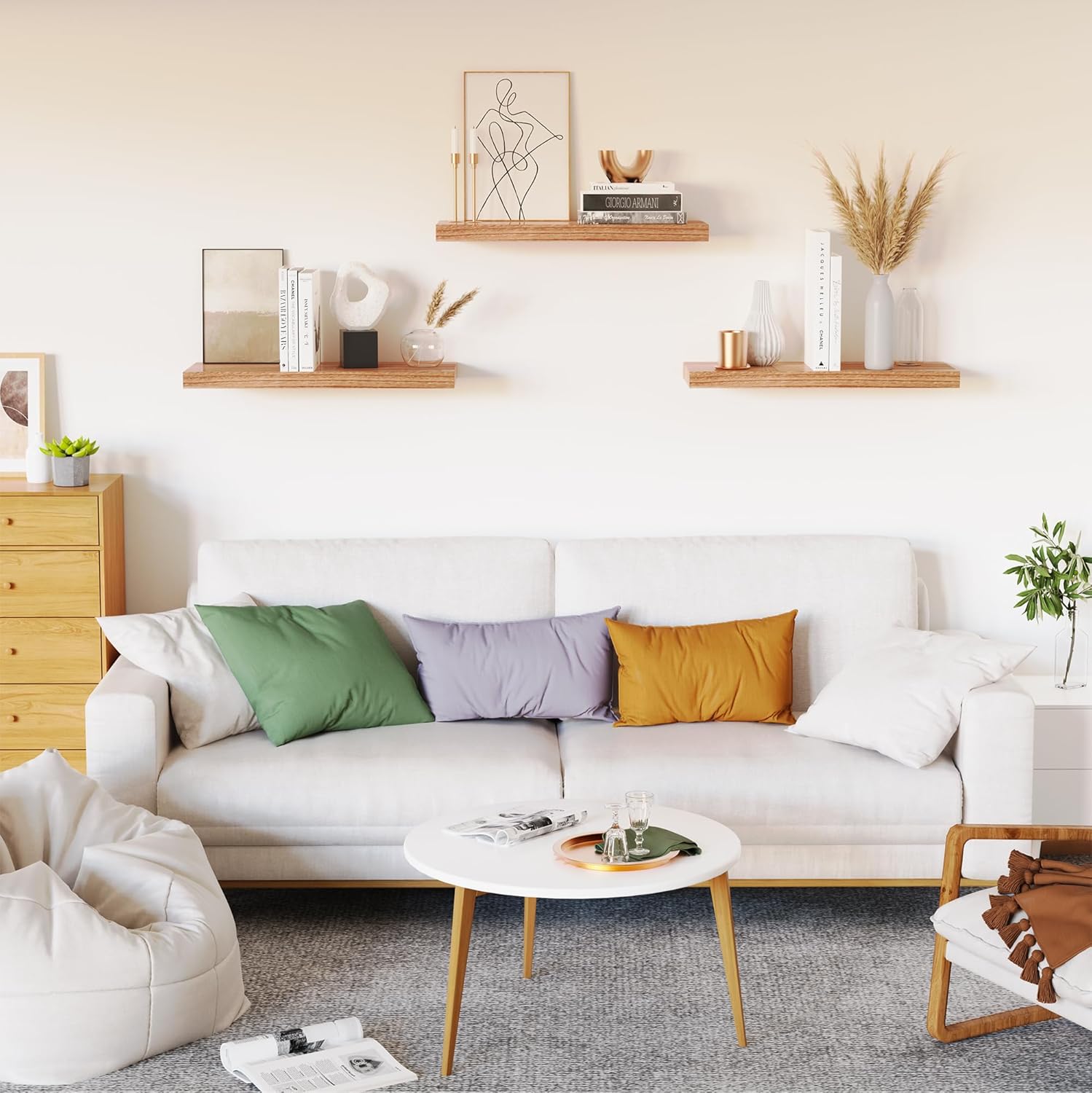 - 【Modern Concise Design】Our white floating shelves are designed with modern simplicity. It has streamlined look to bring modern style and vintage atmosphere to the home. Our wood floating shelves for wall is a set of 3 wall mounted shelves. Our rustic wood shelves can give us plenty of space for creativity, we can choose a line, a ladder shape, or a symmetric way. Let our floating shelf wood more suitable to the home decor and bring a better visual experience.