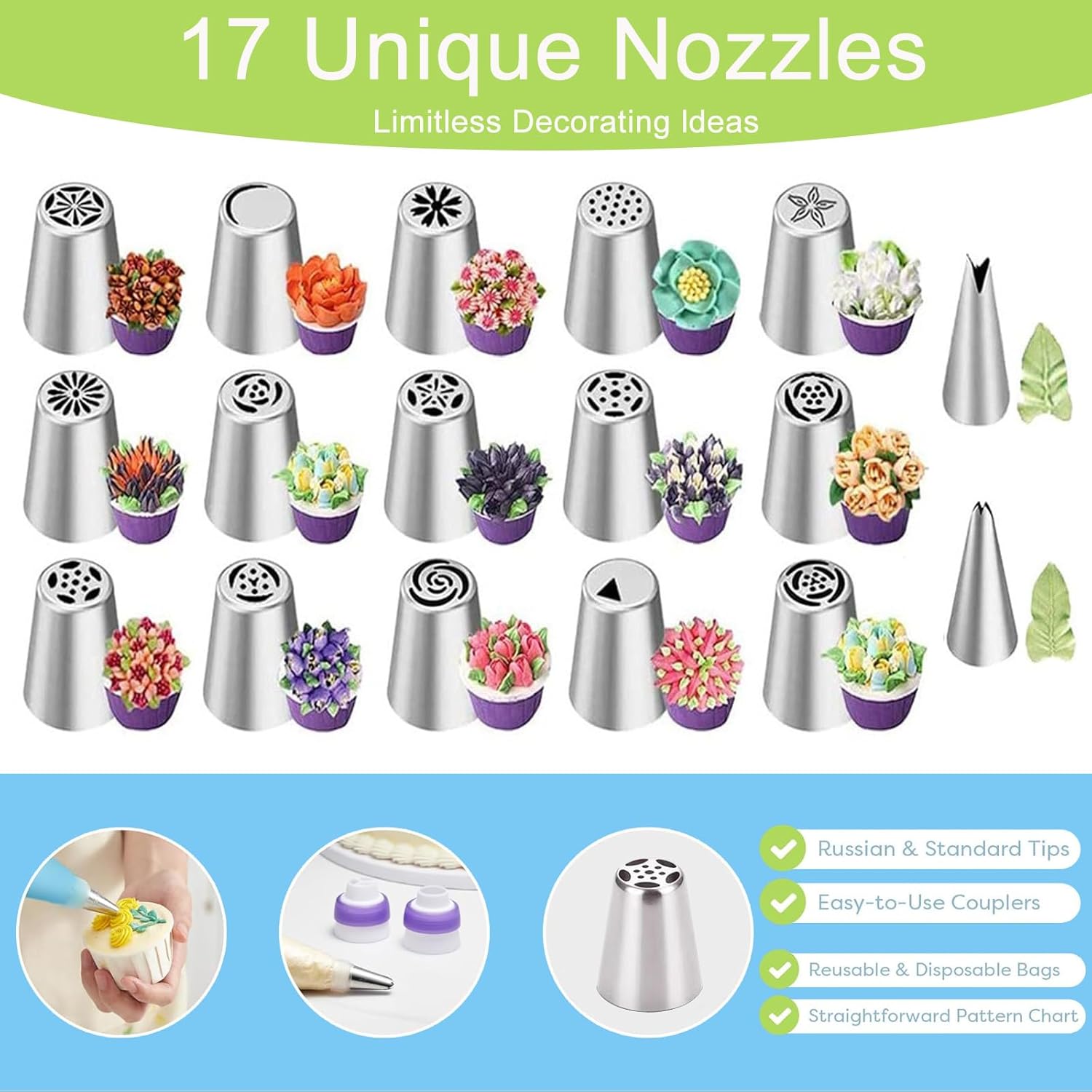 - 【Create Stunning Designs】 With 17 russian piping tips and 2 standard tips, this cake decorating kit allows you to create multiple patterns for cake decorating and cupcake decorating. Whether you're a beginner or a professional baker, this kit makes cake frosting easy and fun.