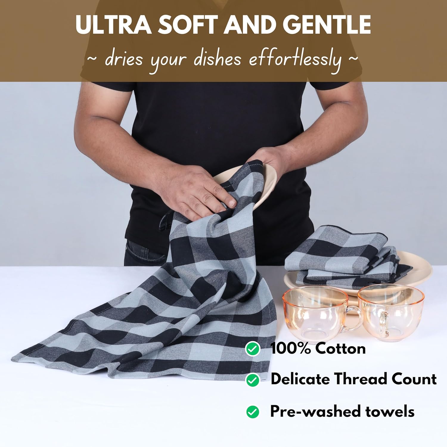 Native Fab 6 Pack Buffalo Check Kitchen Dish Towels, Cotton, Durable, Washable 16"x26" - Tea Towel, Soft Absorbent Cleaning Towels, Hand Towel with Hanging Loop - Black, Grey
