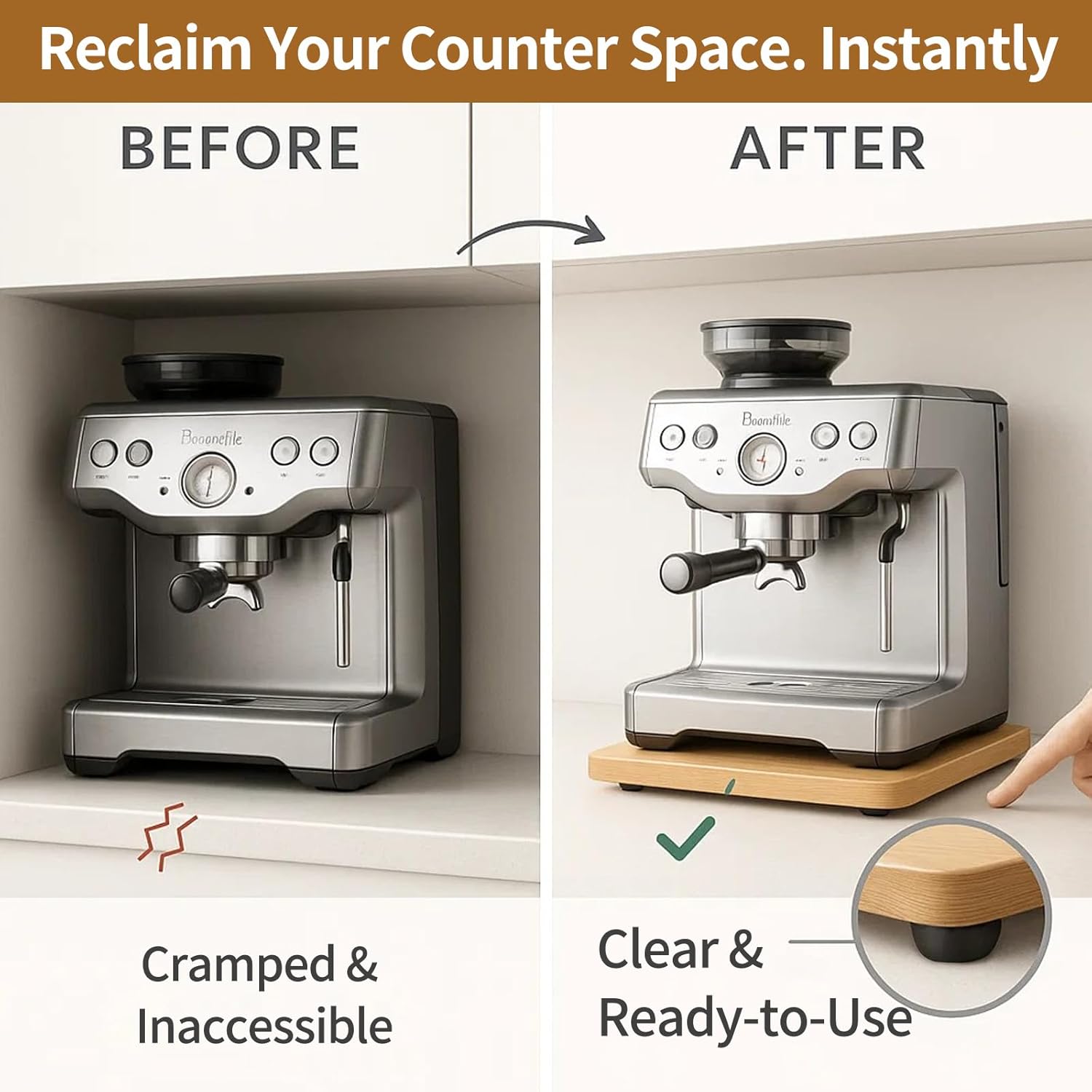 - 【Maximize Your Kitchen Space】Low cabinets can be a hassle for placing your coffee maker. This appliance sliding tray is a brilliant idea and solved the problem perfectly. Now you can easily slide your coffee maker out from under the cabinet for refilling and use, then slide them back. It helps organize your countertop, and makes the most of your kitchen space, keeping everything neat and accessible