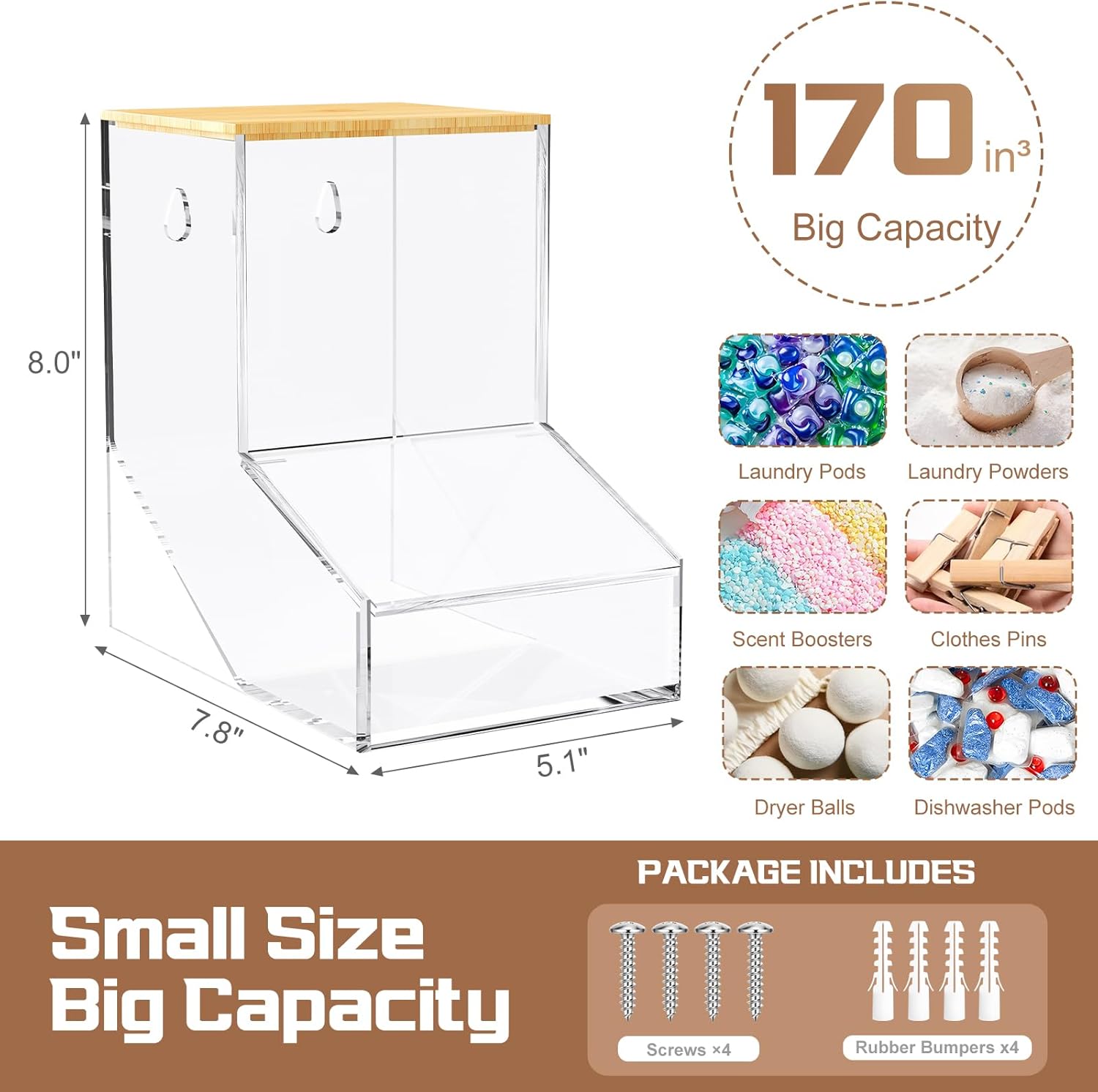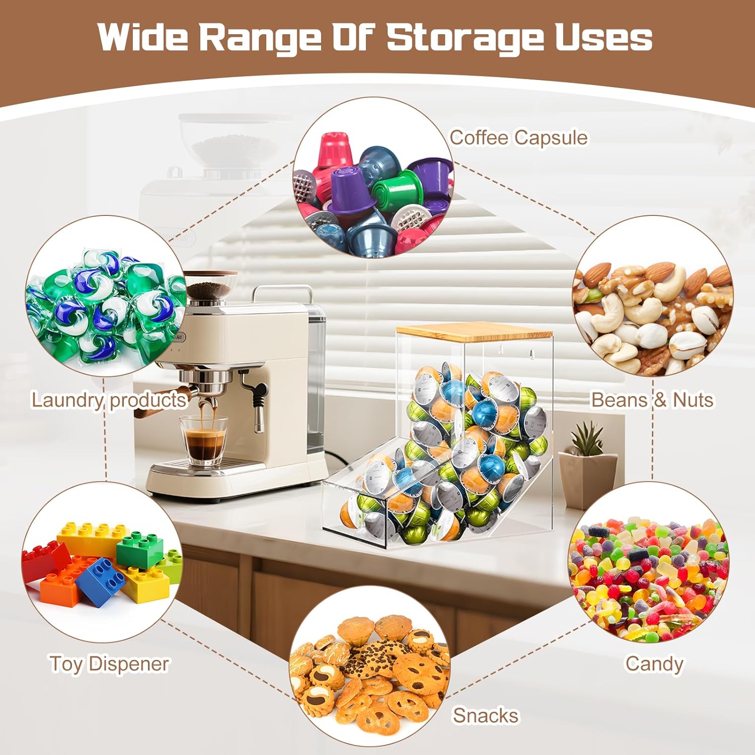 - Easy to Store & Access:This acrylic coffee pod storage box comes with two lids. The wooden lid on top opens easily, making it convenient to put coffee pods inside. The slanted base design allows items to slide to the front of the access area, and the front lid opens for easy access.