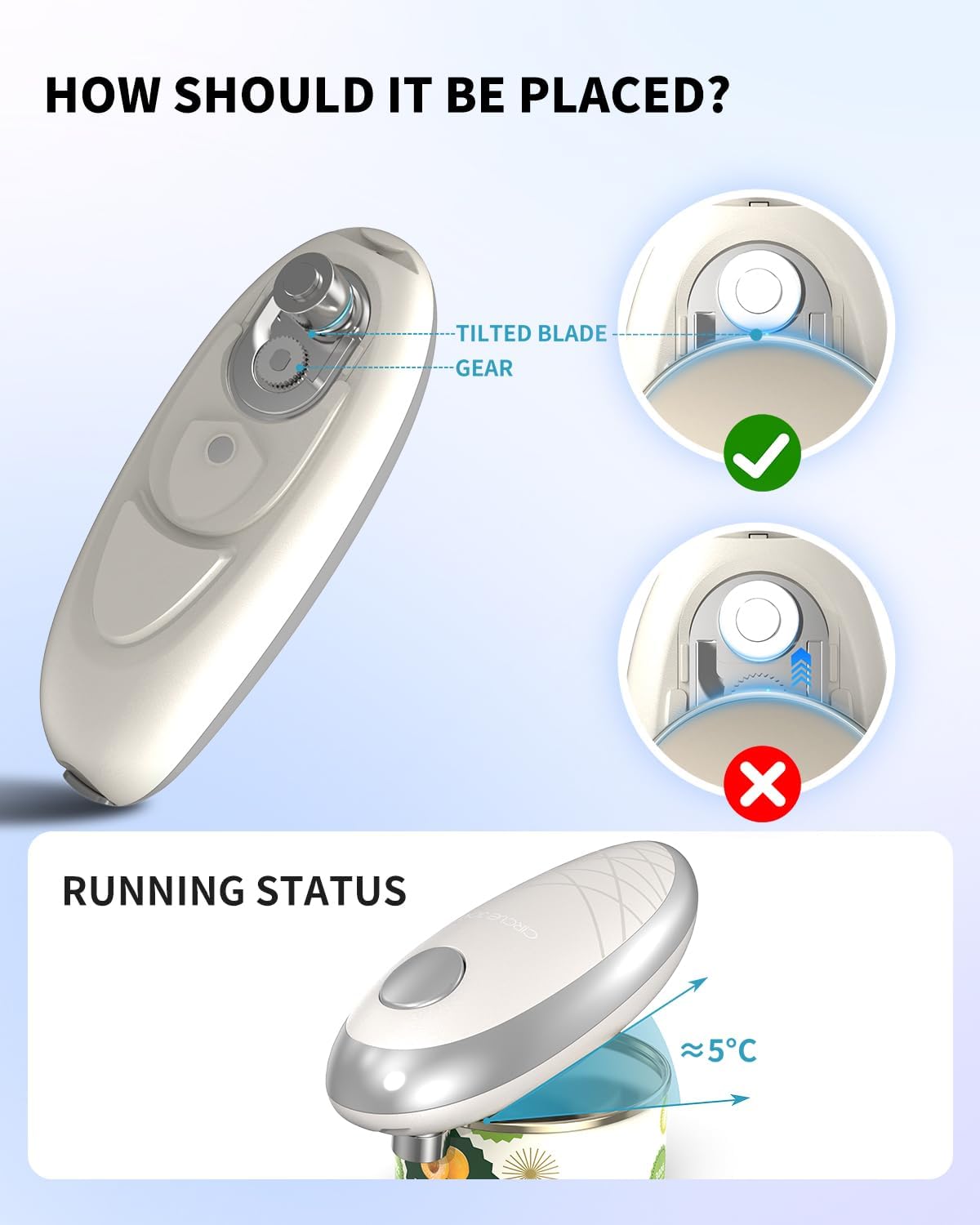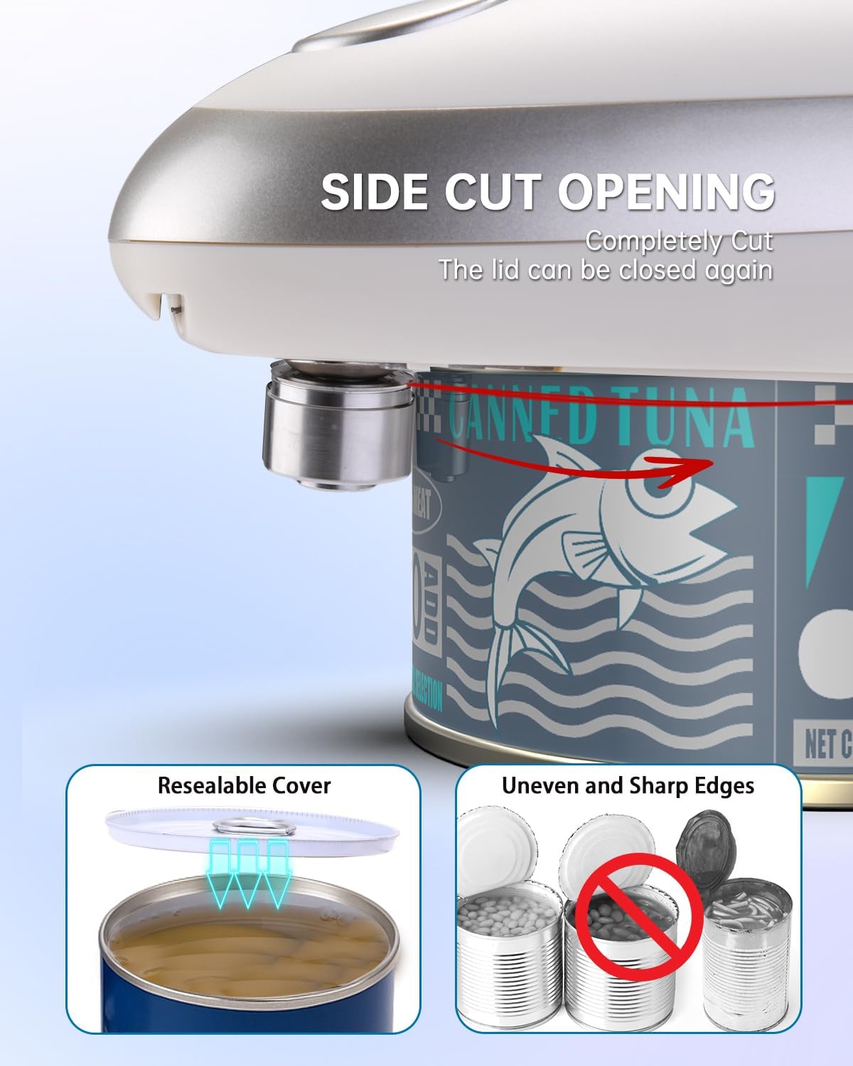 - Smooth & Safe Cutting - No more jagged, dangerous lids! This automatic can opener features a side-cutting mechanism that cleanly cuts the can lid without sharp edges, preventing injuries, it is a good helper for arthritis sufferers and those with limited hand strength.