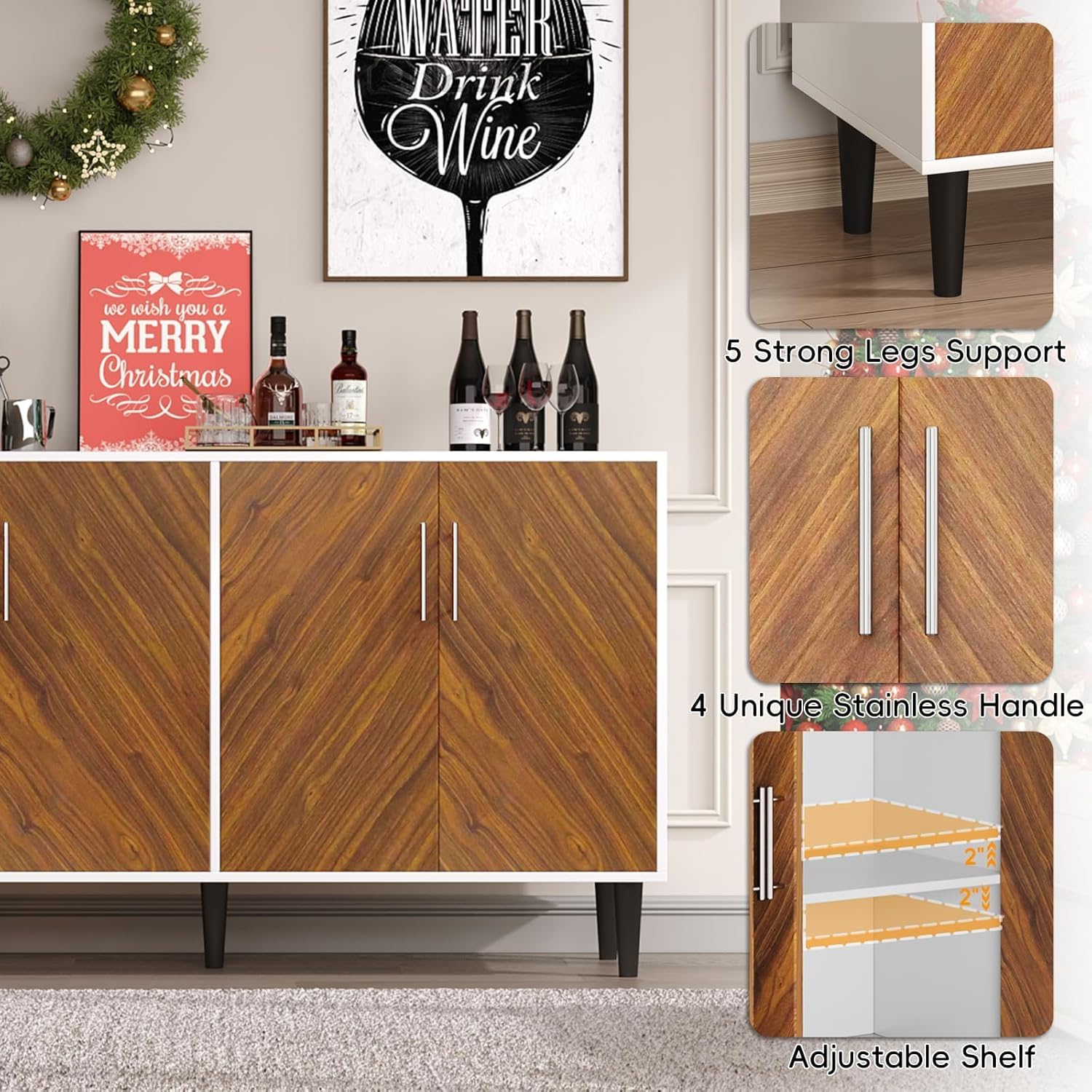4 EVER WINNER Coffee Bar Cabinet with 4 Doors, Sideboard Buffet Cabinet with Storage, Walnut Buffet Cabinet with Storage with Adjustable Shelves for Kitchen,Living Room,White