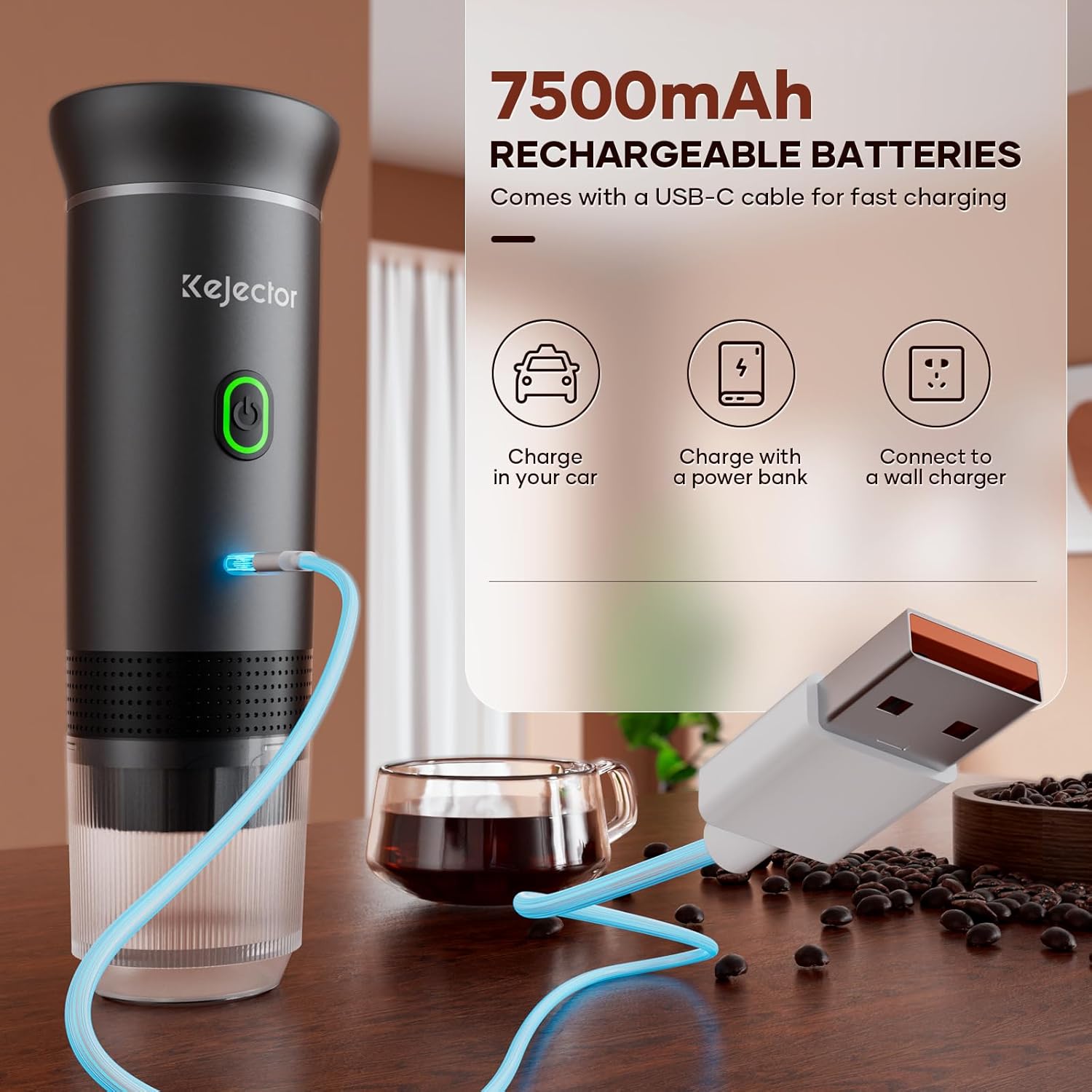 - 【Long-Lasting & USB-C Charging】Equipped with a powerful 7500mAh rechargeable battery, the KEJECTOR portable coffee maker supports up to 4 espresso shots with cold water or 50+ brews with hot water on a single charge. Compatible with USB-C chargers, so you can easily power it up in your car or with a universal charger.