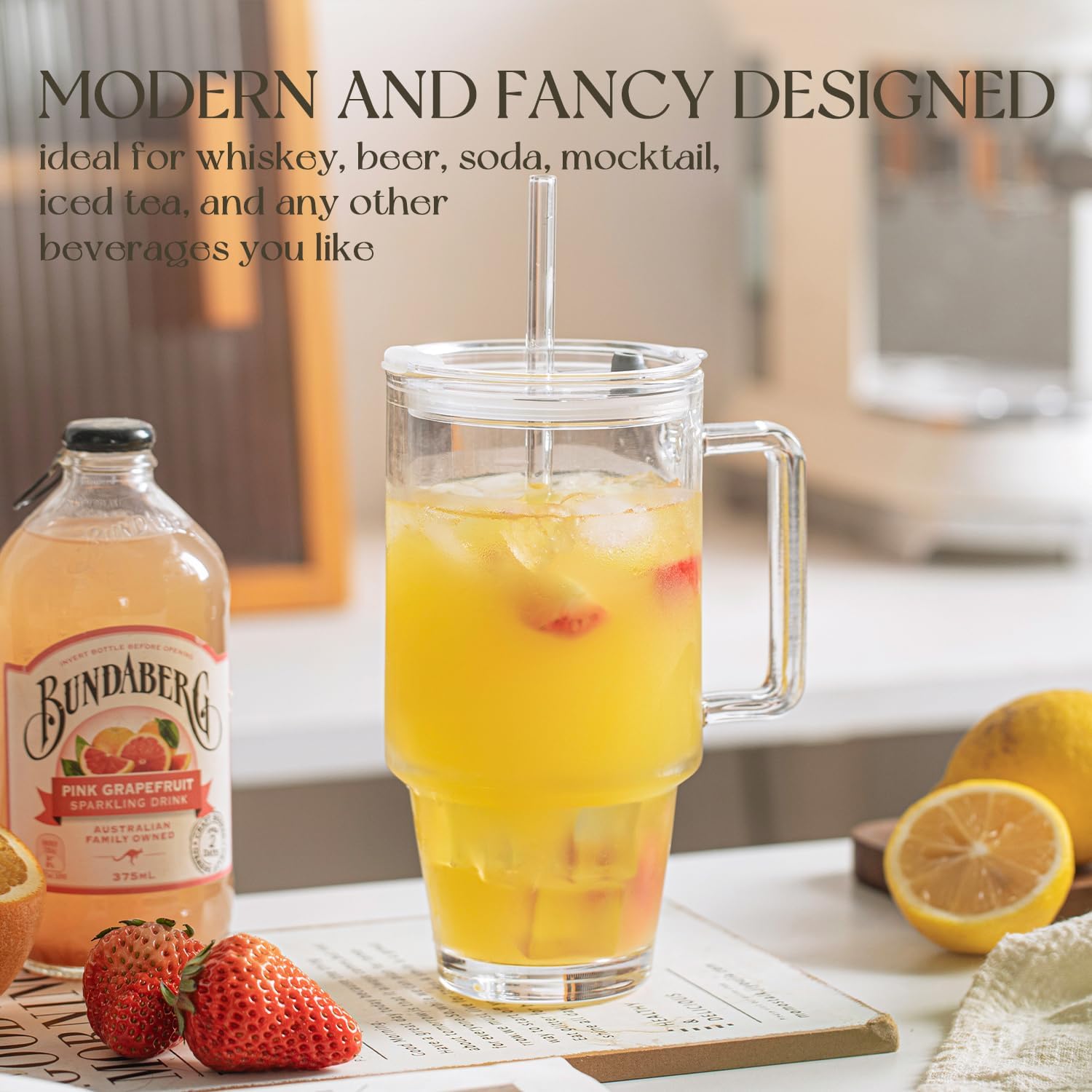 - 【Stylish & Travel-Ready】– Features a sleek transparent design that complements any setting. Comes with a secure lid and glass straw for convenient, spill-proof sipping wherever you go.