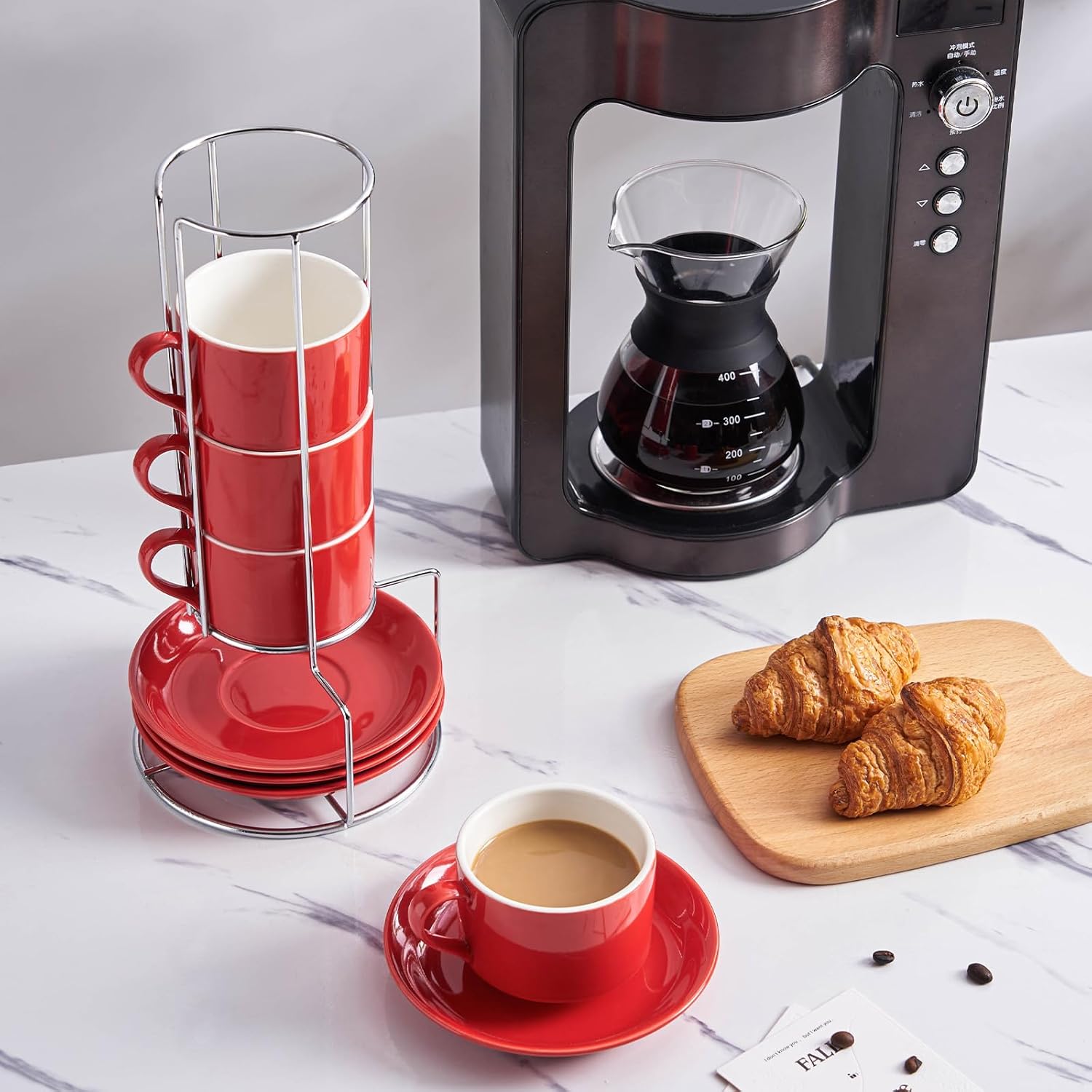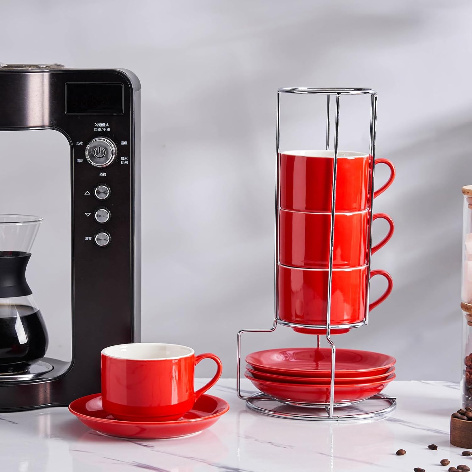 8 Ounce Porcelain Cappuccino Cups with Saucers and Silver Stand, Red Cups Set of 4