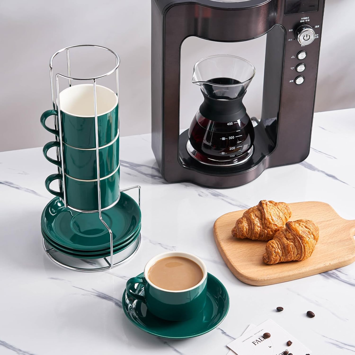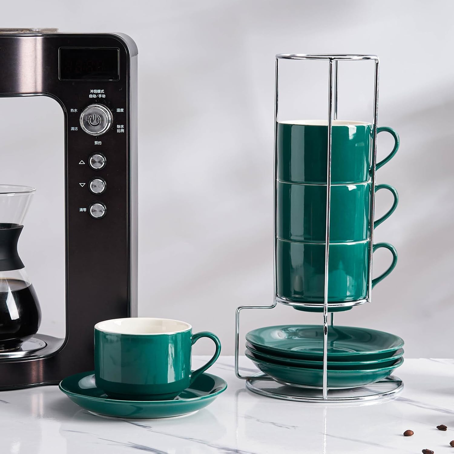 - The cups and saucers can be stacked neatly on the metal stand for easy organization, keeping your coffee corner clean and tidy. Say goodbye to clutter and embrace the simplicity of an organized life.