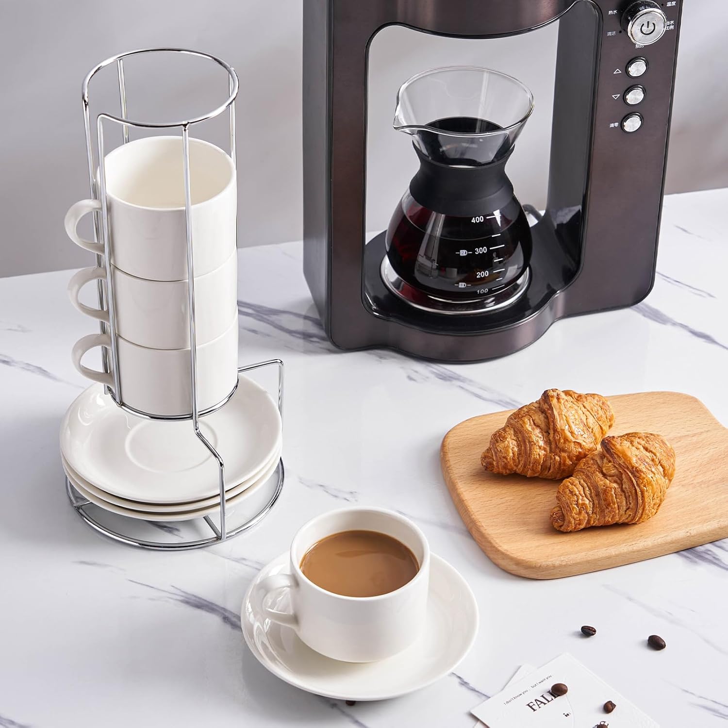 - This set includes 4 coffee cups (8 oz), 4 saucers, and a sleek silver metal stand. Whether you prefer strong espresso, creamy cappuccino, frothy latte, or soothing tea, this coffee cup set meets all your needs for every coffee or tea moment.