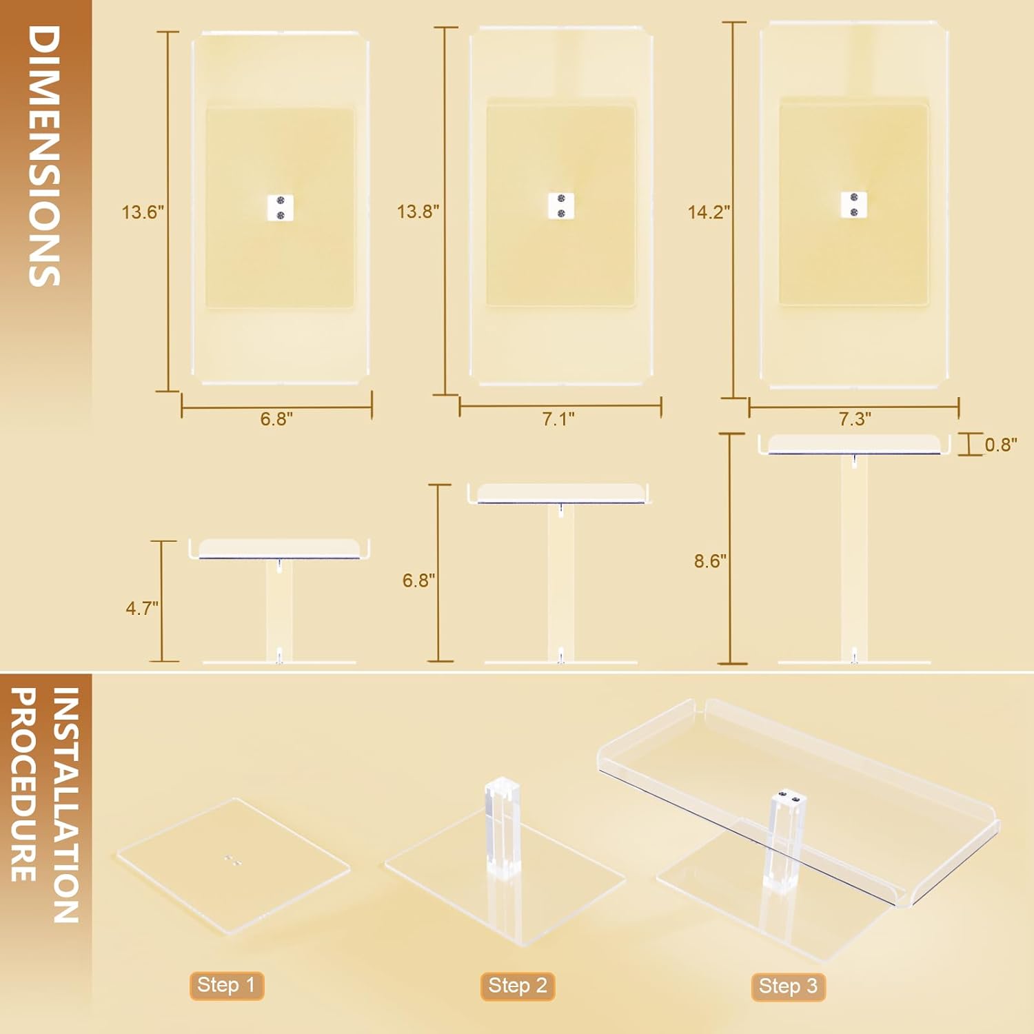 - Detailed Dimensions: This dessert table display set features platters with diameters of 13.6, 13.8, and 14.2 inches, each a substantial 3 mm thick. The assembled dimensions (L x W x H) are 13.6 x 6.8 x 4.7, 13.8 x 7.1 x 6.8, and 14.2 x 7.3 x 8.6 inches, accommodating up to 54 standard 2-inch cupcakes.