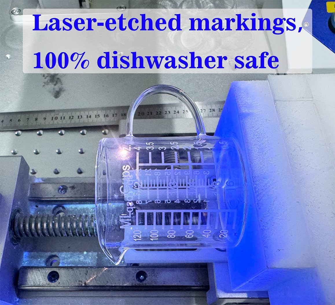- 【Etched Graduations】: The measuring cup features etched graduations in Five units (ML,Cup,OZ,Tablespoons,Teaspoons). The front of the handle displays ML,US Cups and OZ measurements, while the back shows Tablespoons and Teaspoonsmeasurements for precise work. This ensures you can measure all types of liquids and follow any recipe with ease. It is 100% dishwasher safe, allowing you to trust it for hassle-free cleaning