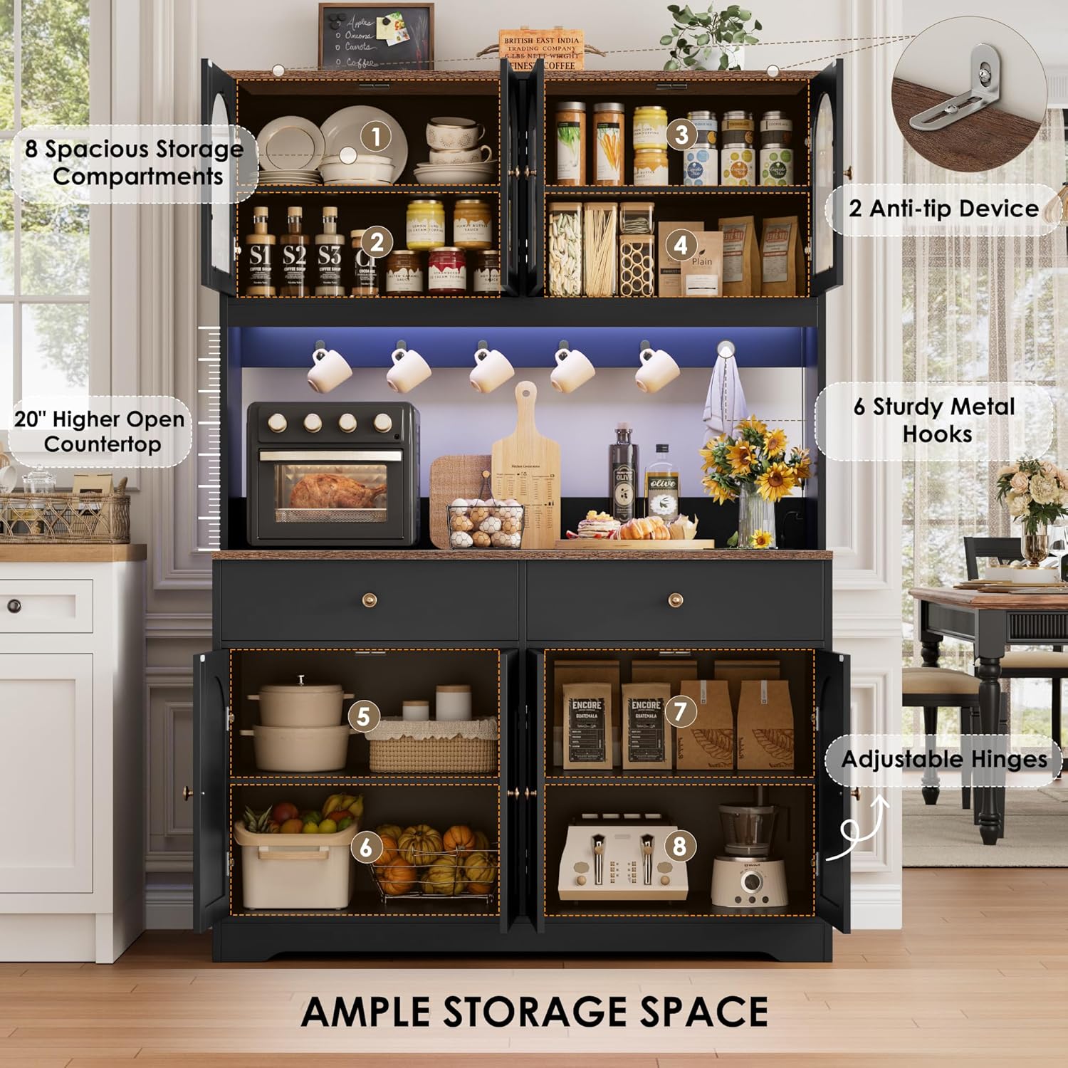 - AMPLE STORAGE SPACE: Our large kitchen cabinet combines a buffet and an upper hutch cabinet, offering 8 roomy compartments to meet all your needs. The generous countertop provides an ideal surface for placing a coffee machine or serving drinks and snacks to guests, while the 6 sturdy hooks are perfect for hanging bottle openers, mugs or other kitchen accessories, keeping them within easy reach. Plus, 2 large drawers are thoughtfully designed to keep cutlery and condiments neatly organized