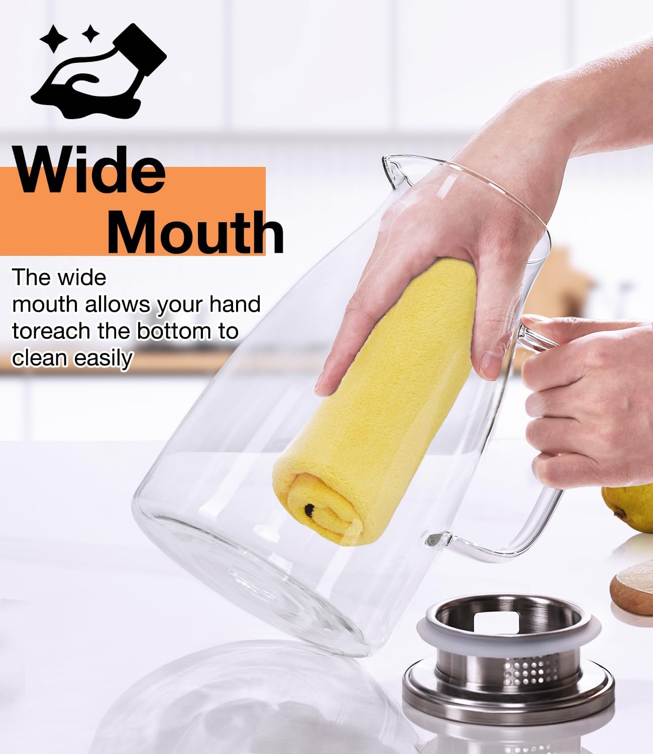 - PRACTICAL DESIGN: Glass Pitcher comes with premium 304 stainless steel lid that has 2 pouring options. The strainer section filters out small debris such as tea or fruit, while the open top section speeds up the flow of water. The food-grade Silicone Ring on the lid has a Thickened design to prevent leaks and drops. Two extra seals are included and can be replaced if they wear out over time.