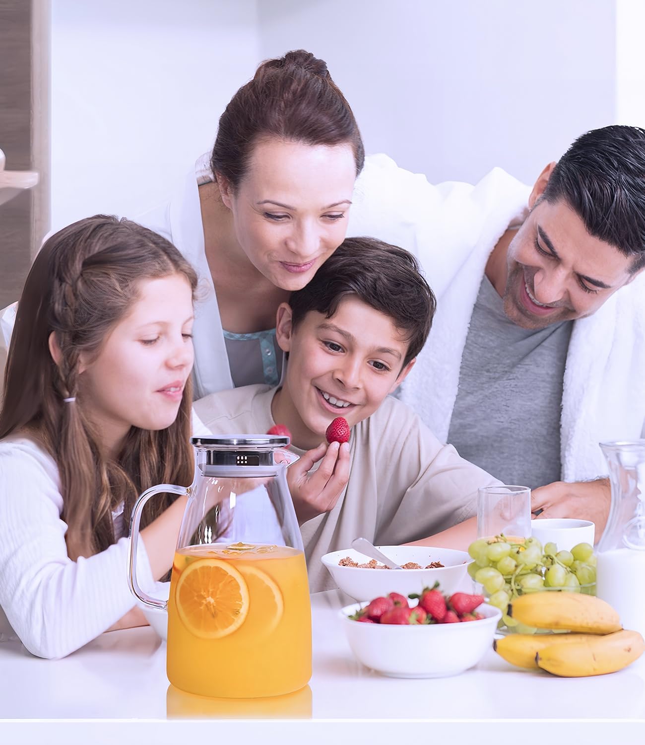 - DURABLE HIGH BOROSILICONE GLASS: The jug can withstand temperatures from -4 to 302°F. The clear pitcher is handmade, lead-free, BPA-free. Glass pitcher with handle and lid for fridge and ceramic heaters, ideal for cold and hot beverages, making it a healthy choice for everyday use.
