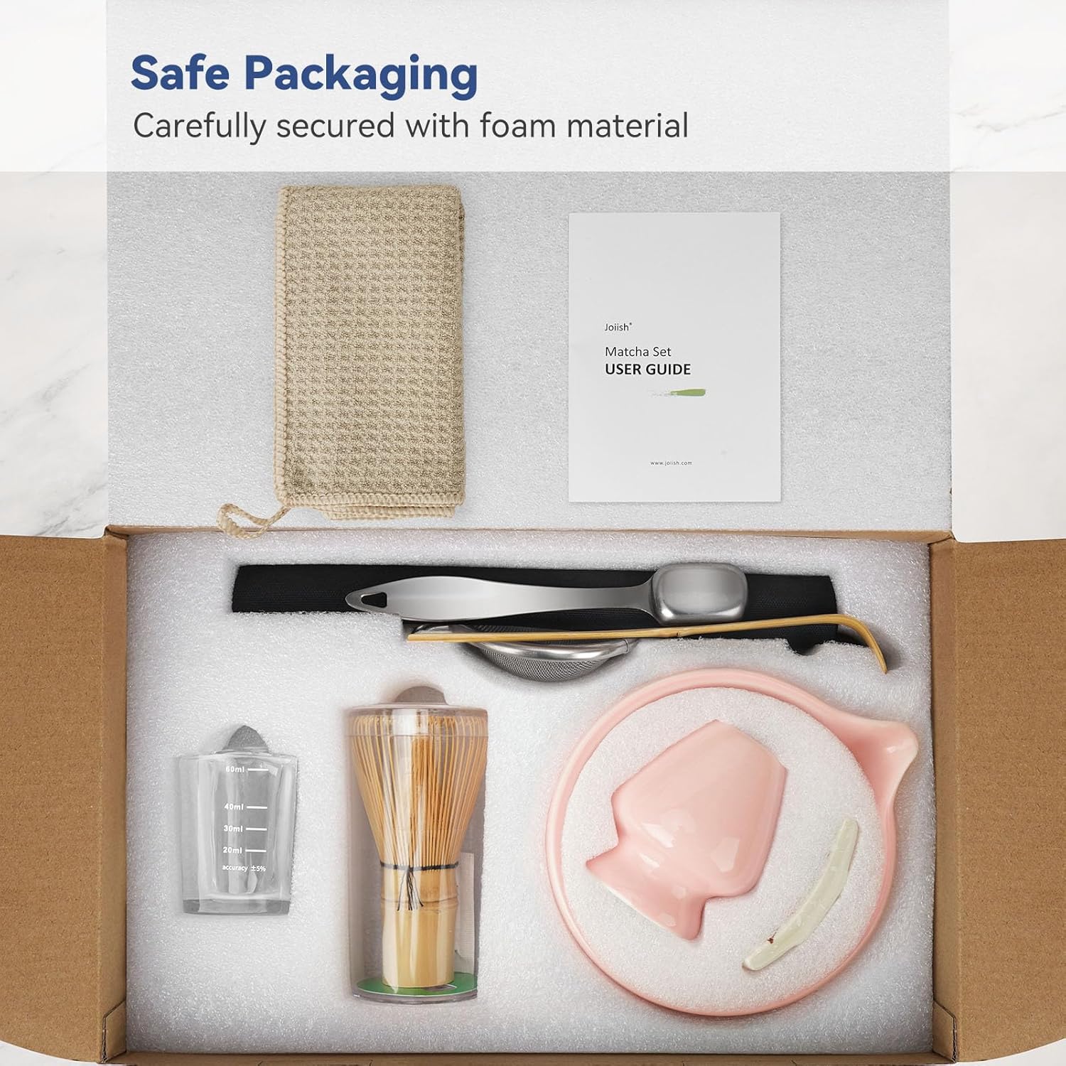 - Beginner-Friendly Measuring Aids: The matcha starter set contains a stainless steel measuring spoon (1tsp/2g) and measuring glass (2oz/60ml) to help you easily get the precise powder/water ratio whether when making standard matcha flavor or exploring the unique taste to your liking (NOTE: Measuring cup is not microwavable)