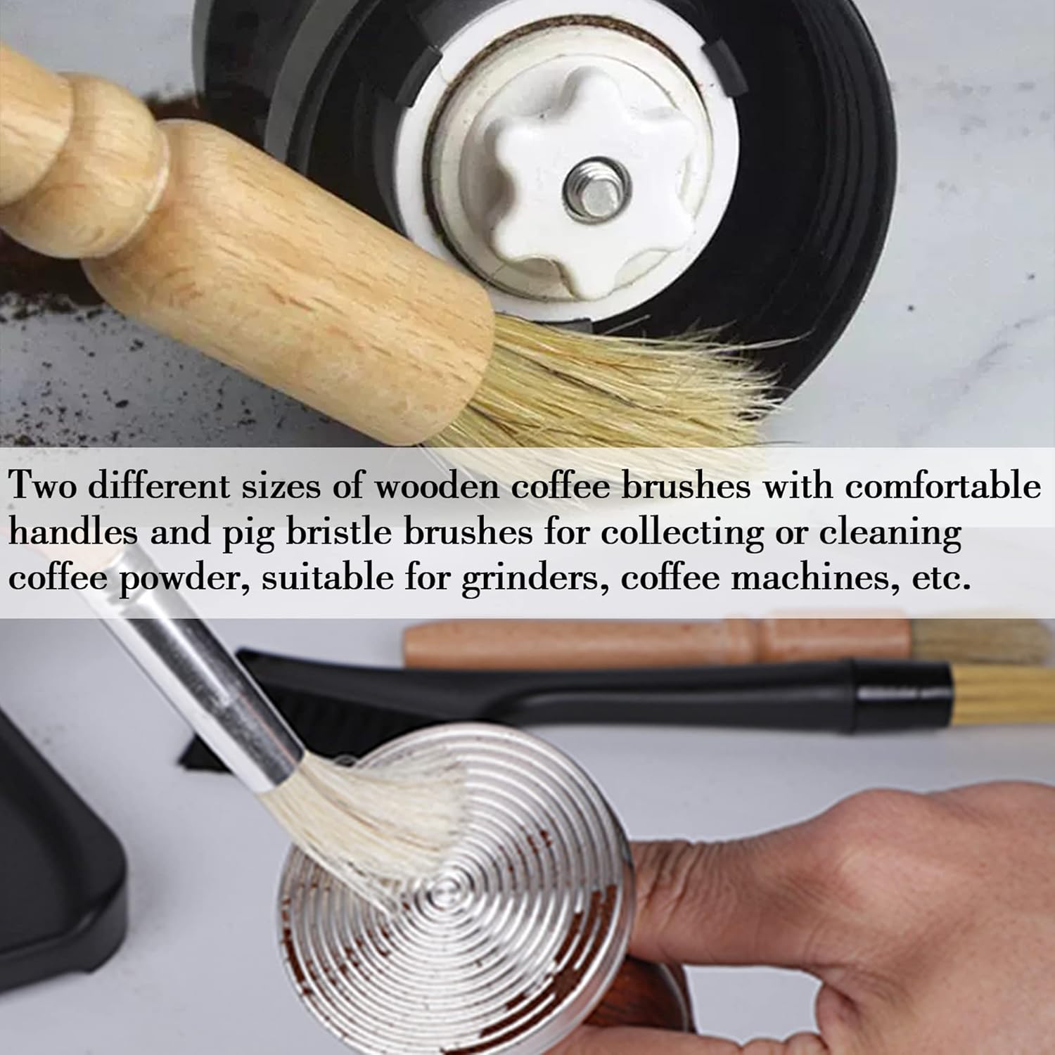 - Two coffee brushes with wooden handles in different sizes, natural boar bristle brush head is used to collect or clean coffee powder, suitable for use in dry environment, please note that using in water will reduce the service life