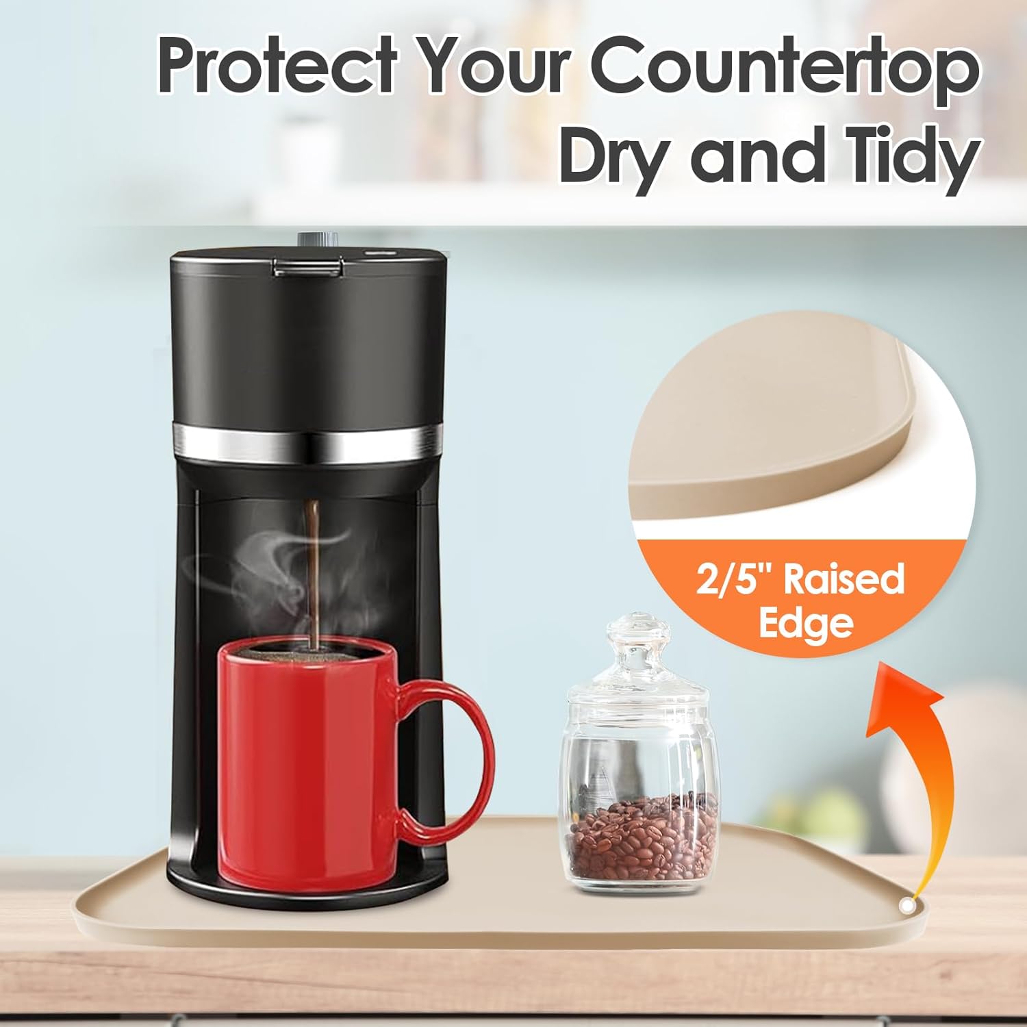 - 100% Water Does Not Flow Out: The coffee maker mat is built with 2/5" raised edge, like a tray and it can contain any liquid spills from the coffee maker. The premium material not only protect your countertop from scratches, especially protect the wood countertop, but also keep your your countertop tidy, clean.