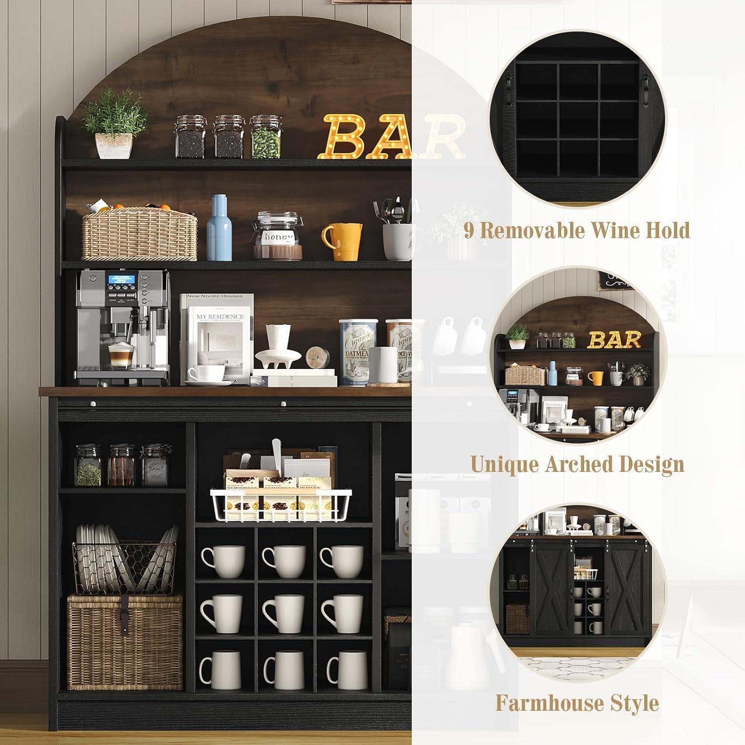 - Multifunctional Scenario: This coffee bars allows you to stylishly display and store your coffee cups and tableware. The kitchen hutch storage cabinet can also be used as a bar cabinet, coffee bar, home bar, tableware cabinet, TV bar, and more. It is the ideal coffee bar for kitchens, living rooms, dining rooms, and offices