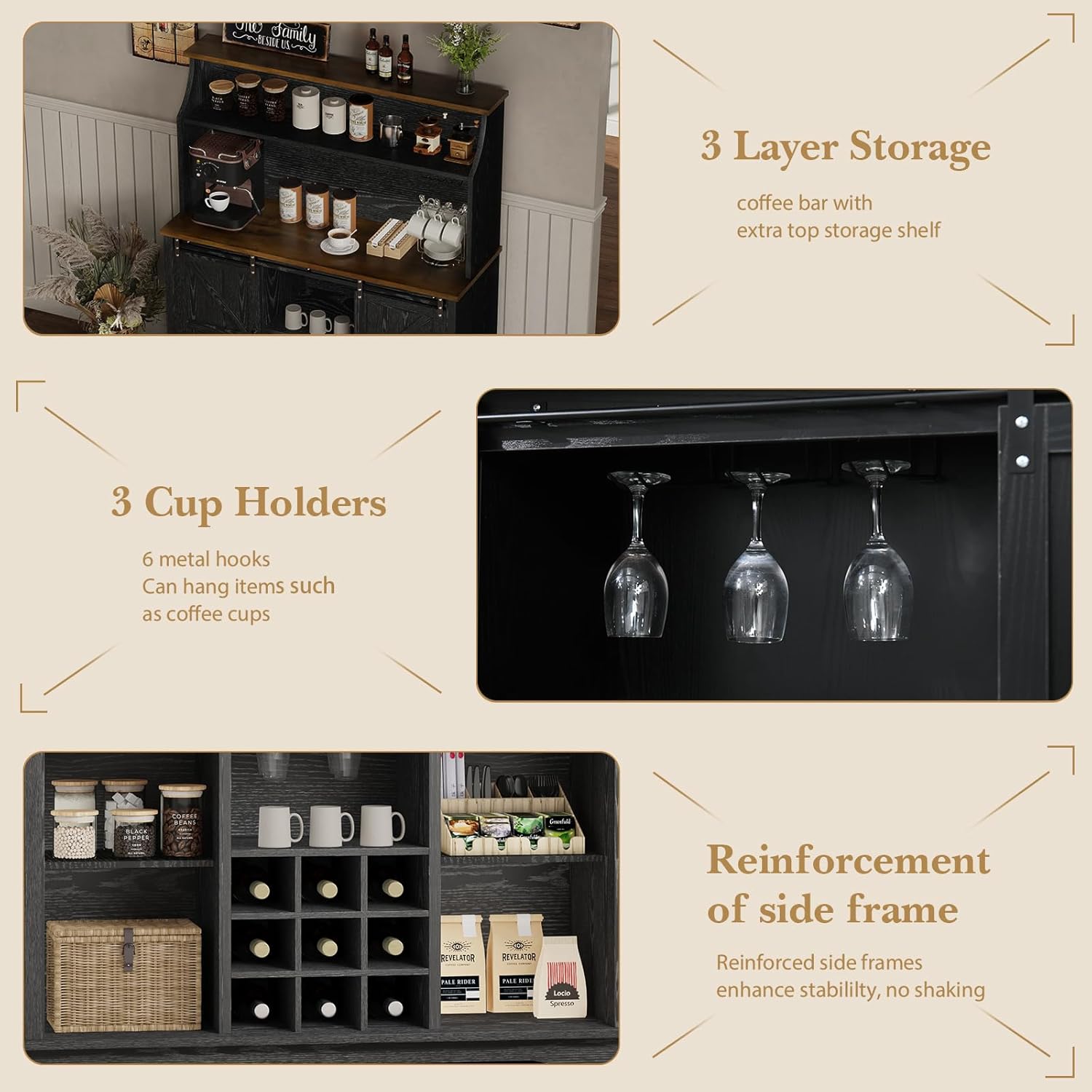 - [Multifunctional Storage Design] The coffee cabinet features 9 wine racks, 3 glass holders, 6 hooks to store and display wine utensils/coffee cups/tea sets, creating a warm family coffee bar and wine bar