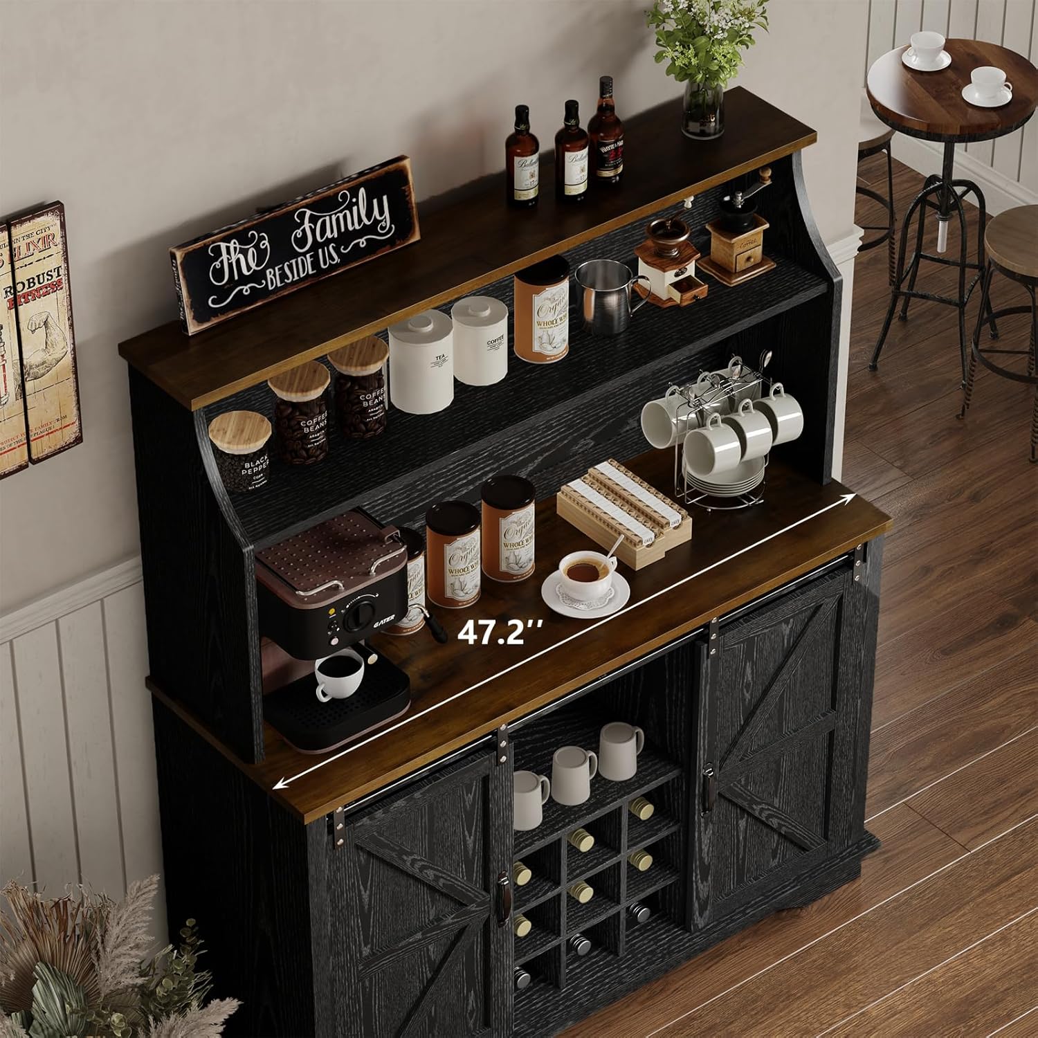 47 Inch Farmhouse Coffee Bar Cabinet with 3-Tier Storage, Kitchen Hutch with 9 Wine Racks & 3 Glass Holders, Coffee Bar with 6 Hooks, Wine Bar Cabinet for Dining Living Room, Black
