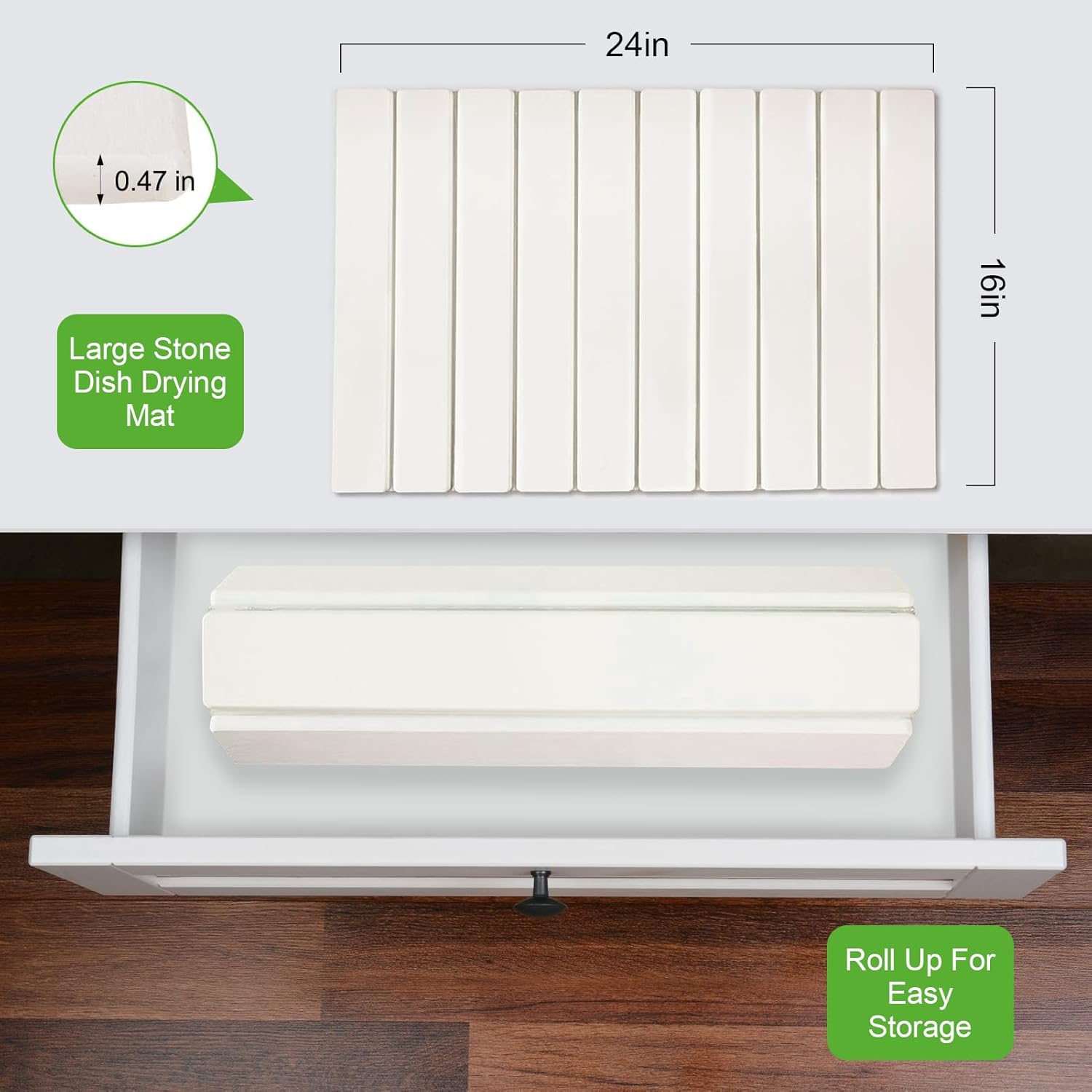 - Foldable and Space-Saving Design: Measuring 24"×16" when unfolded, this large stone drying mat for kitchen counter accommodates more kitchenware than standard drying pads. Whether stored in drawers or kitchen cabinets, it saves valuable kitchen space.