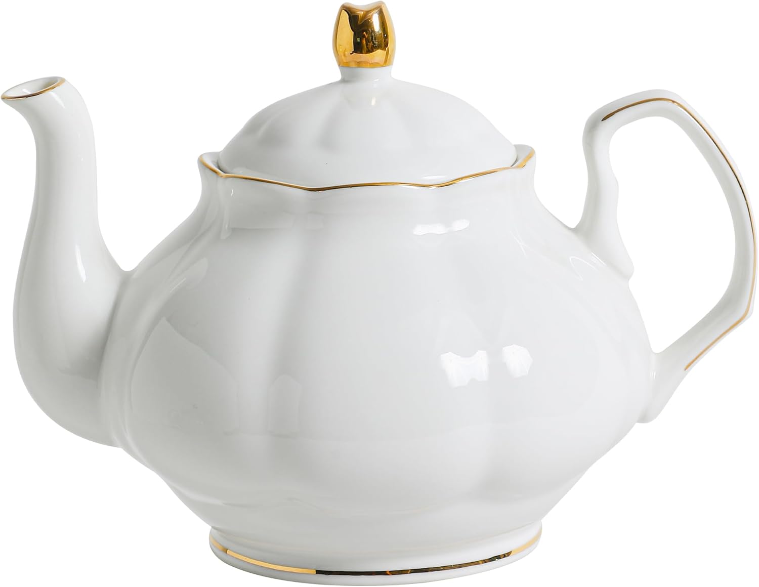 27oz White Porcelain Teapot with Gold Trim, Classic Ceramic Teapot for Loose Leaf Tea & Tea Bags, Elegant Small Teapots for Daily Use or Gifts