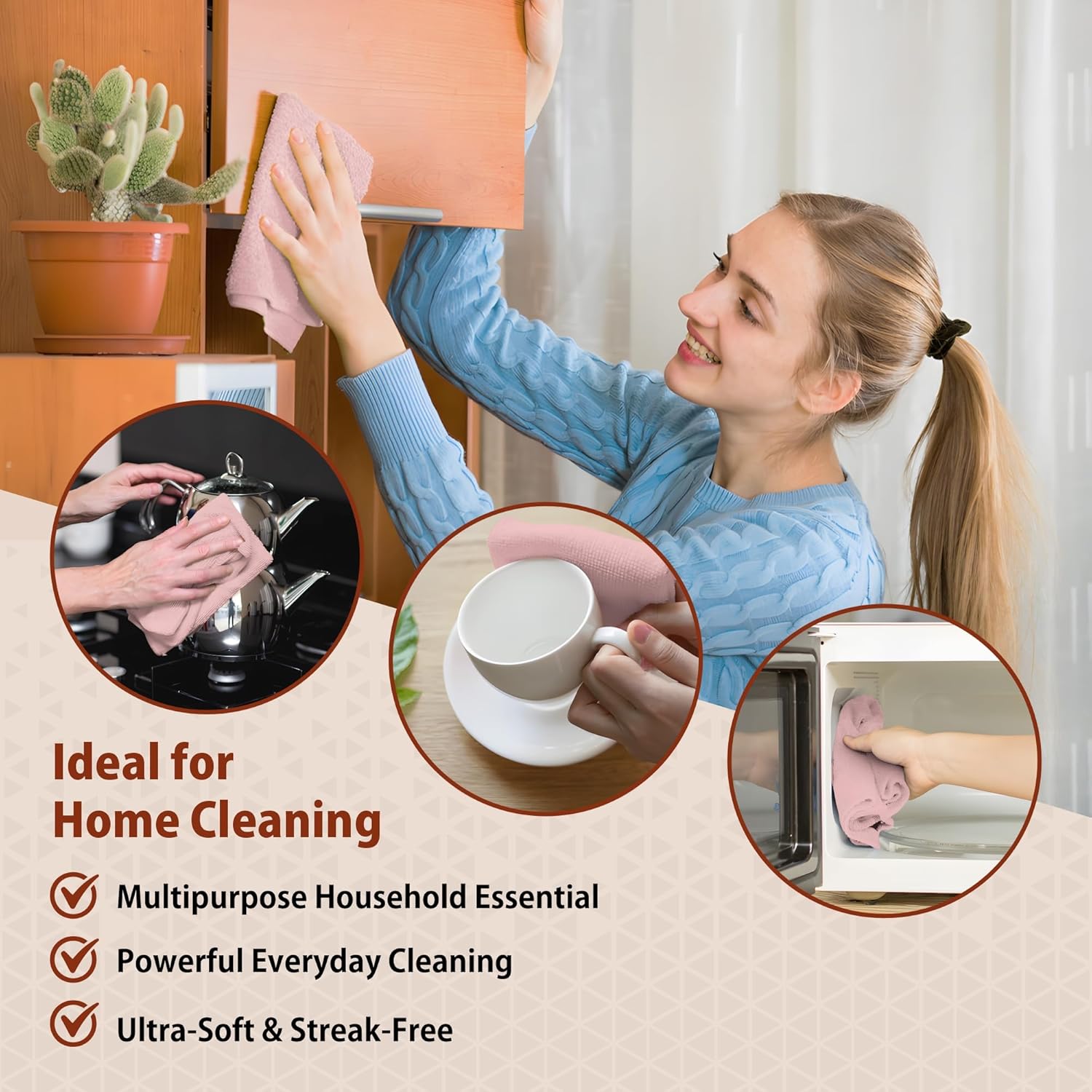 - Microfiber cleaning cloths 11.81x11.81 Inches; provide a soft texture gentle, ideal for cleaning, kitchens, garages, workshops, glass, mirrors, windows and stainless steel without leaving residue.