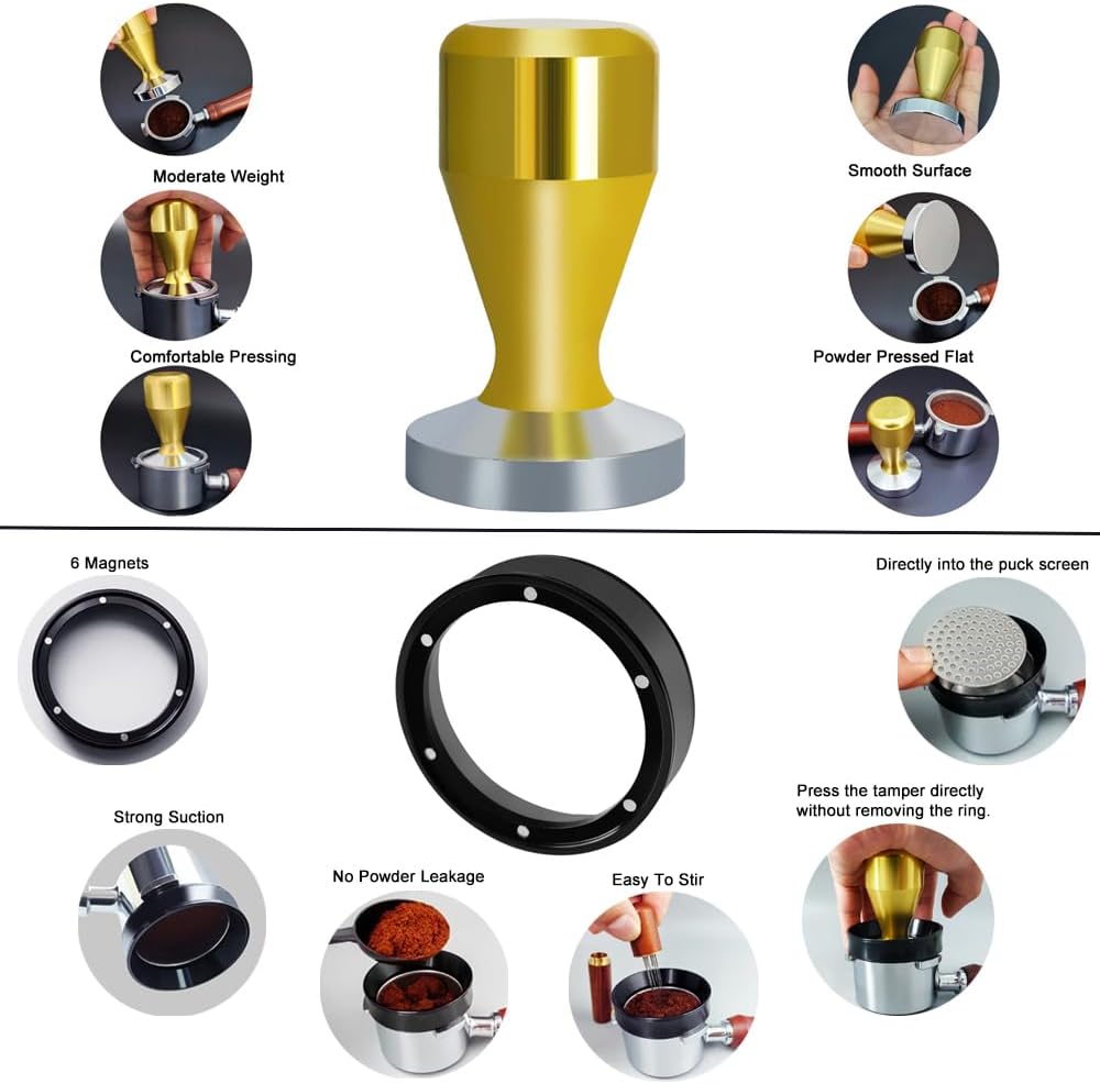 51mm Espresso Tamper Set, 5PCS Coffee Tamper Kit with WDT Tool, Coffee Stirrer, Dosing Funnel, Puck Screen 51mm Espresso Accessories Tampers Kit (Gold)