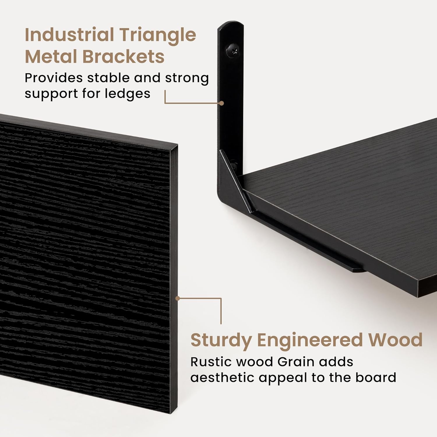 - 【Strong & Durable Construction for Long-Lasting Use】Each shelf is made from premium high-density MDF with a smooth, durable surface resistant to warping and cracking. Paired with heavy-duty black L-shaped steel brackets, these shelves provide excellent strength and stability. Properly installed, each shelf supports up to 50 lbs, perfect for books, kitchen items, and decor. Built to endure daily use in kitchens, living rooms, offices, or bathrooms, combining durability with timeless style.