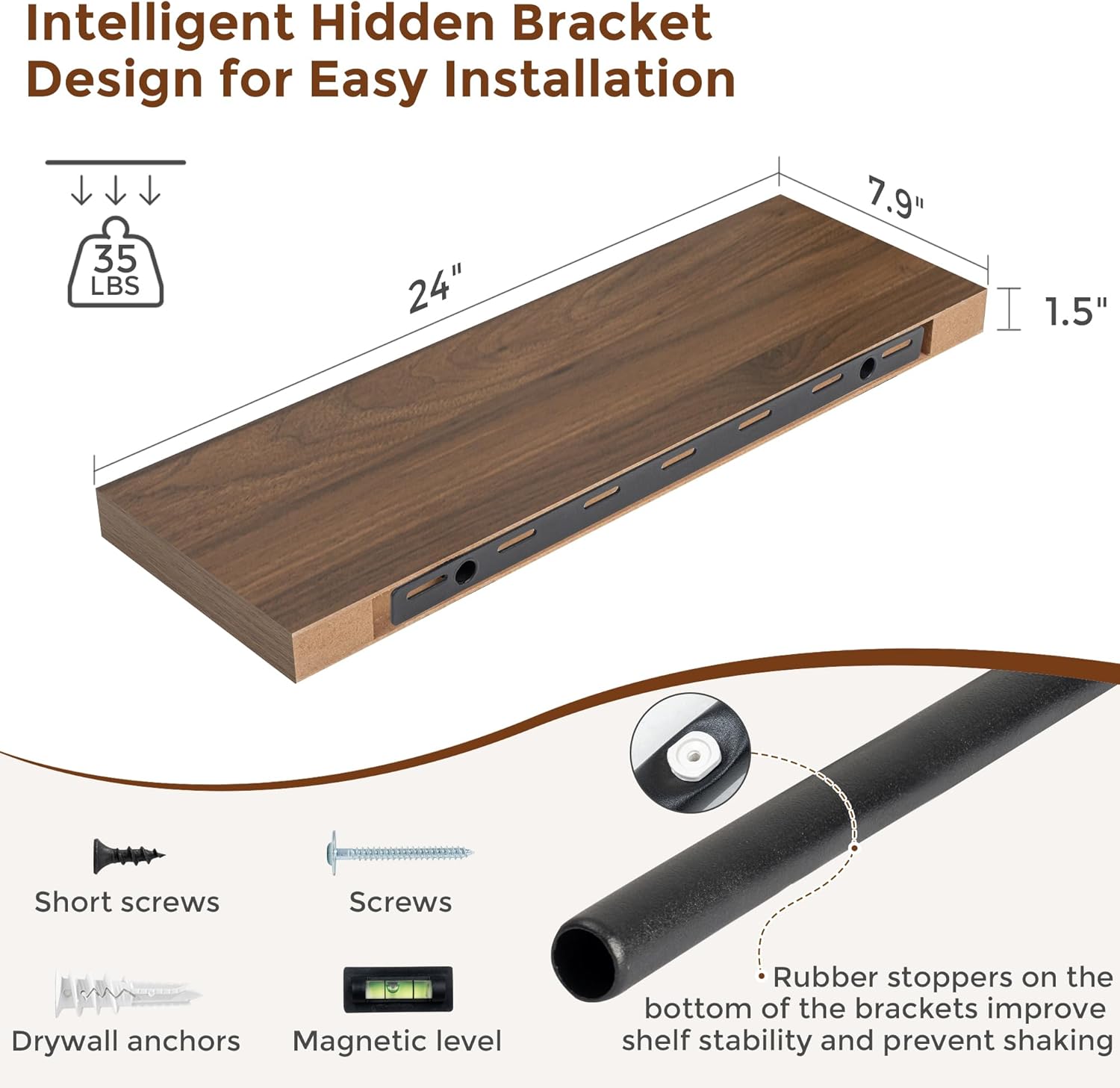 Heimlove 24 Inch Floating Shelves for Wall Walnut Shelves Set of 2,Wall Mounted Rustic Wood 8 Inch Deep Floating Shelf with Invisible Brackets for Bedroom Kitchen Living Room