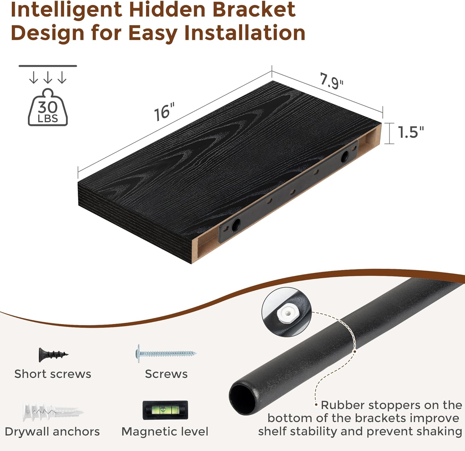 - 【Easy To Install】This black floating shelves not only come with stainless-steel galvanized invisible brackets, but also equipped a fixing screw at the bottom to fix the shelf on the support rod, which solves the problem of sliding and is not easy to damage, and can be used for a long time. Instructions, magnetic level, drywall anchors, and screws included.