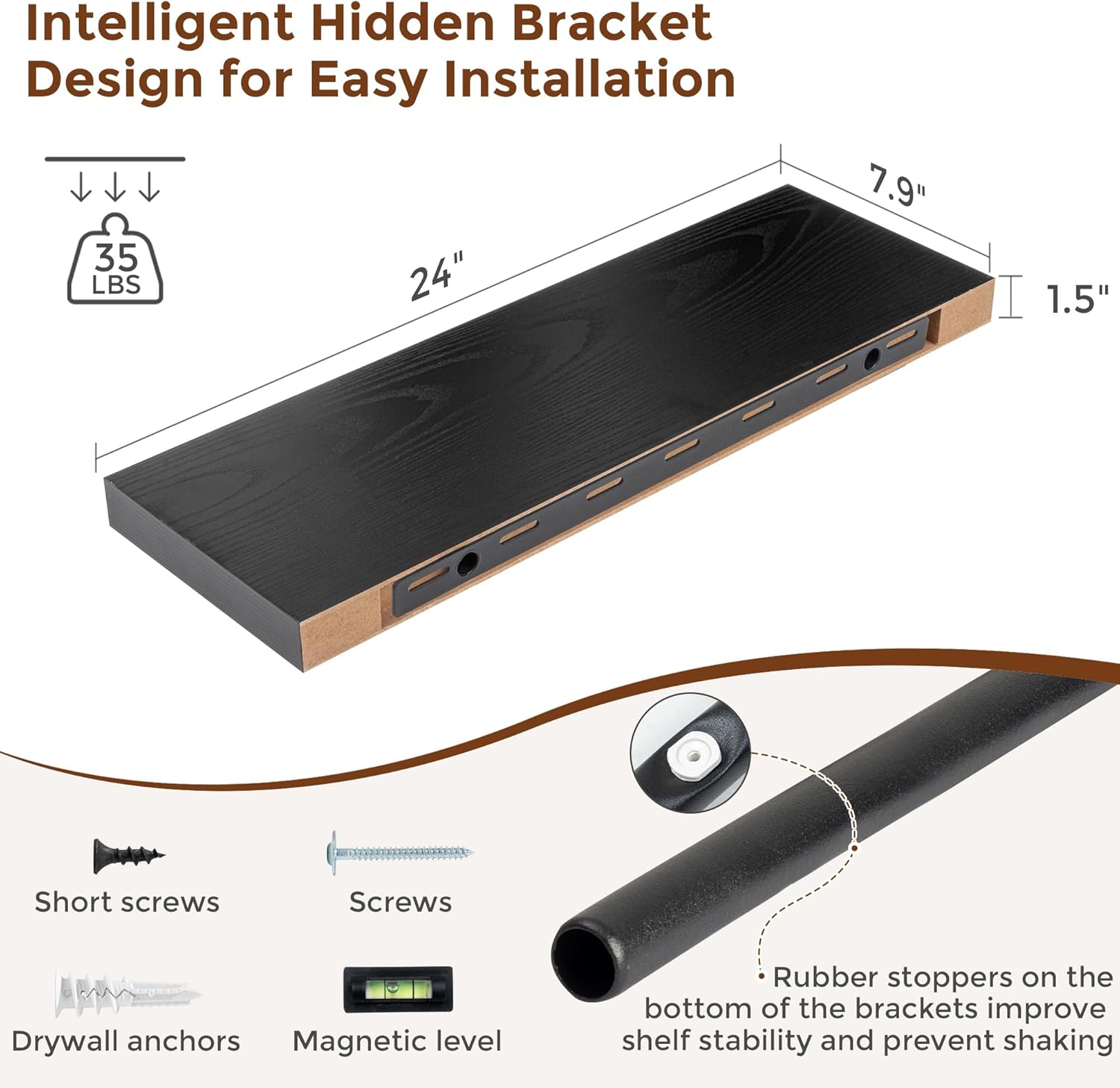 - 【Easy To Install】This black floating shelves not only come with stainless-steel galvanized invisible brackets, but also equipped a fixing screw at the bottom to fix the shelf on the support rod, which solves the problem of sliding and is not easy to damage, and can be used for a long time. Instructions, magnetic level, drywall anchors, and screws included.