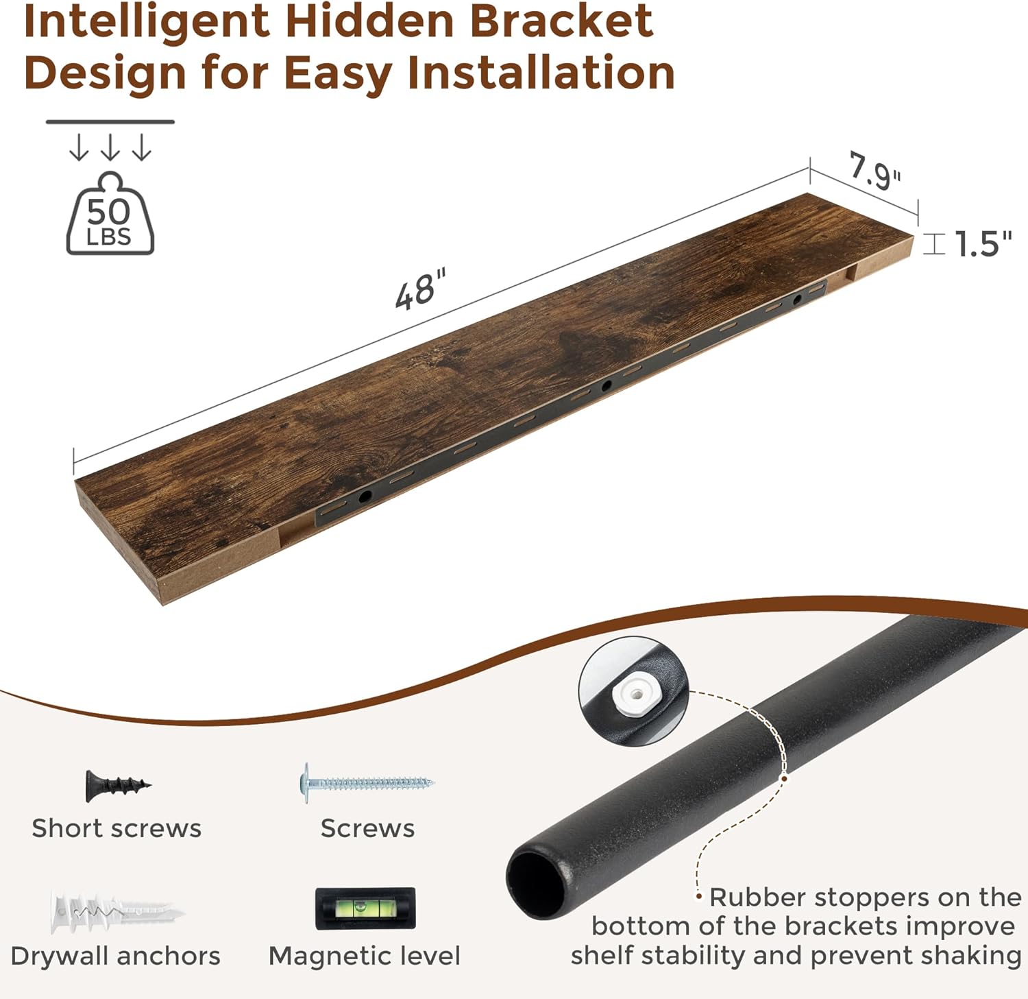 Heimlove 48 Inch Floating Shelves for Wall 8 Inch Deep Rustic Brown Shelves Set of 2,Wall Mounted Rustic Wood Long Floating Shelf,Large Display & Storage Shelf with Invisible Brackets