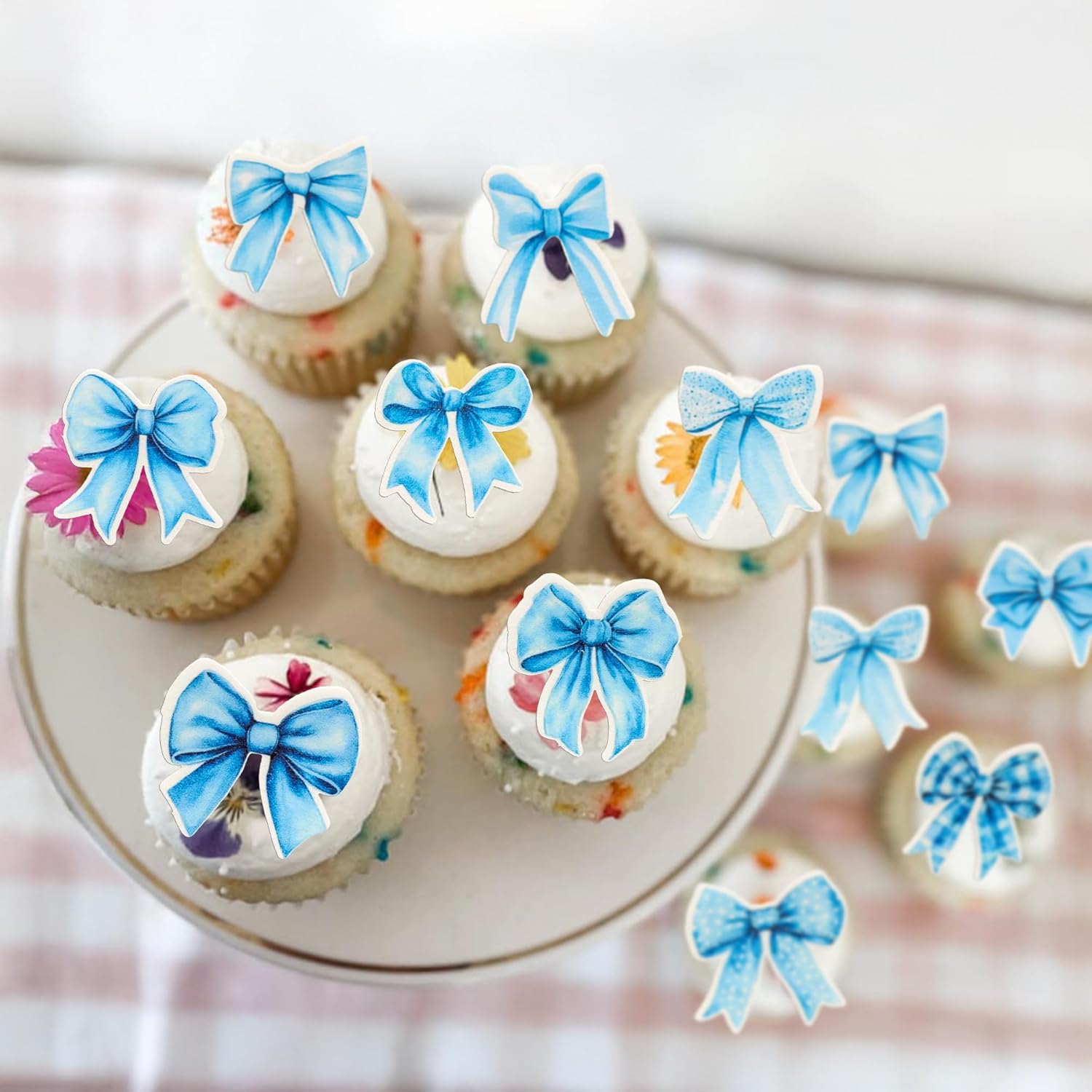 Gyufise 50Pcs Edible Blue Bowknot Cupcake Toppers Wafer Paper Bowknot Cake Dessert Picks Baby Shower Princess Cupcake Toppers for Birthday Party Decoration Supplies