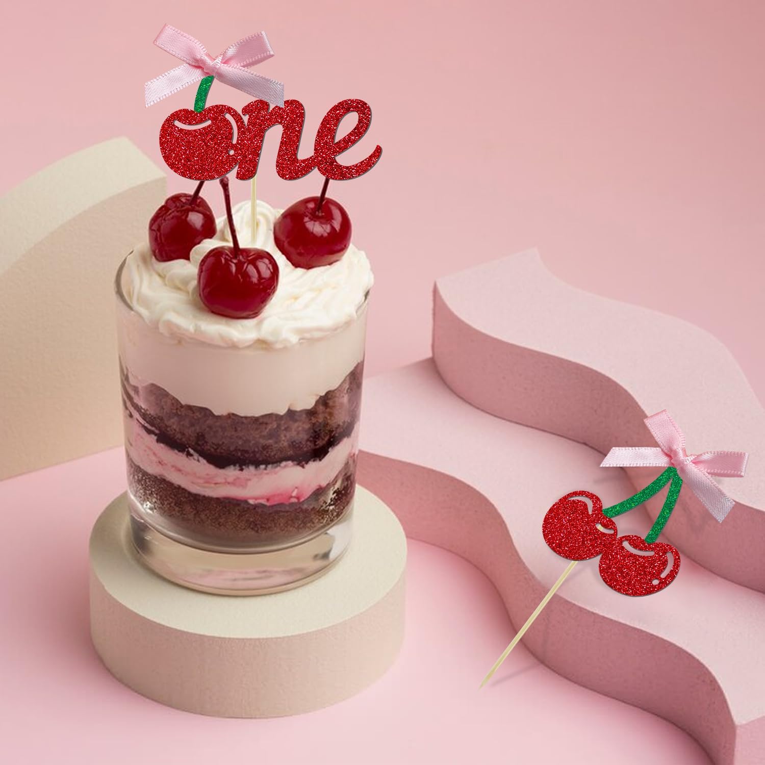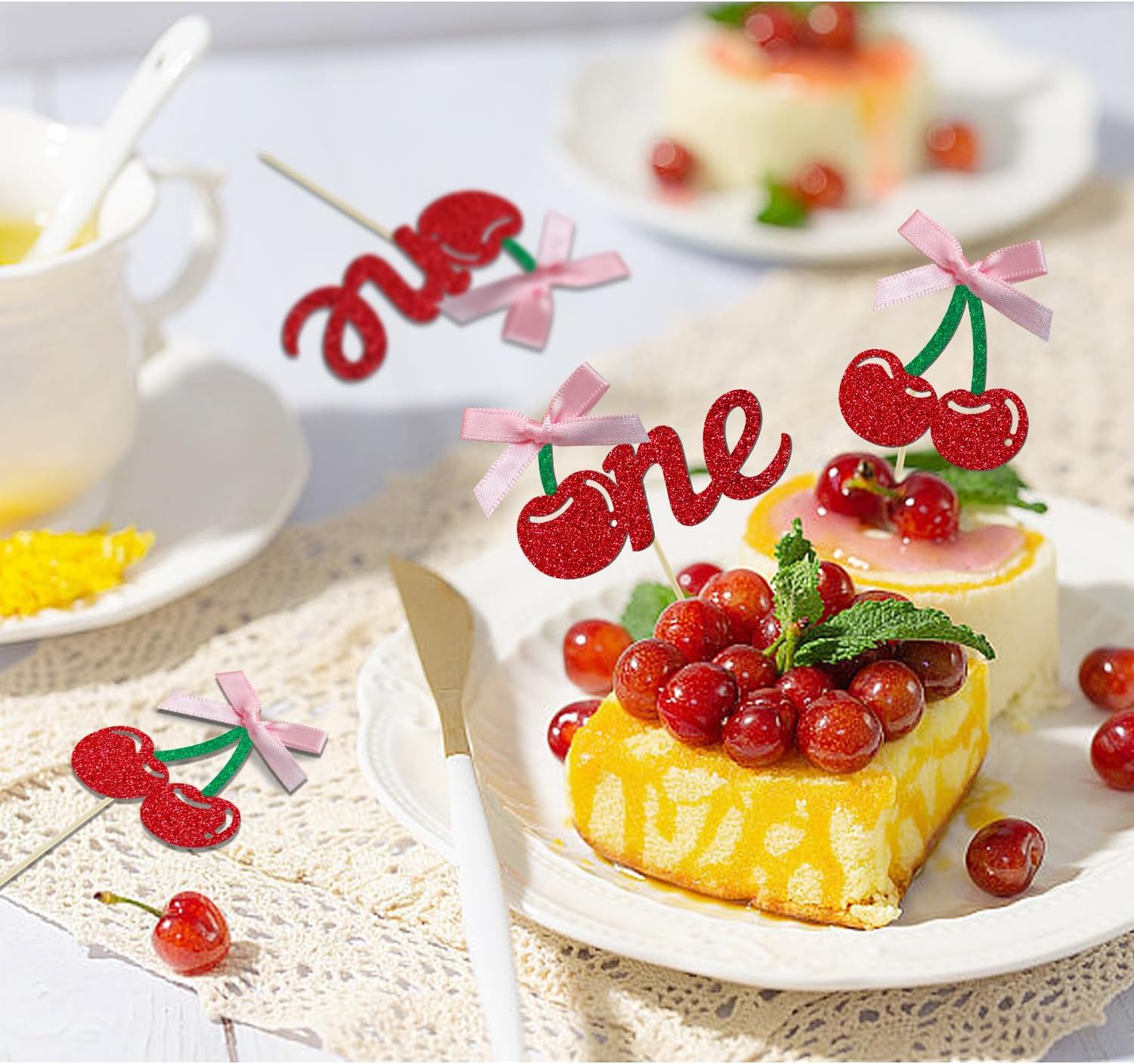 - 【Cherry Cake Topper】:These sparkling and cute cake decorations are excellent accessory for cherry or fruits party. The top features a unique cherry design, with cherries paired with satin bows that stand out and add extra radiance and cuteness. These cherry cake toppers will make your cake more attractive and everyone will love it! It's also a great photo prop to make your party more fun!
