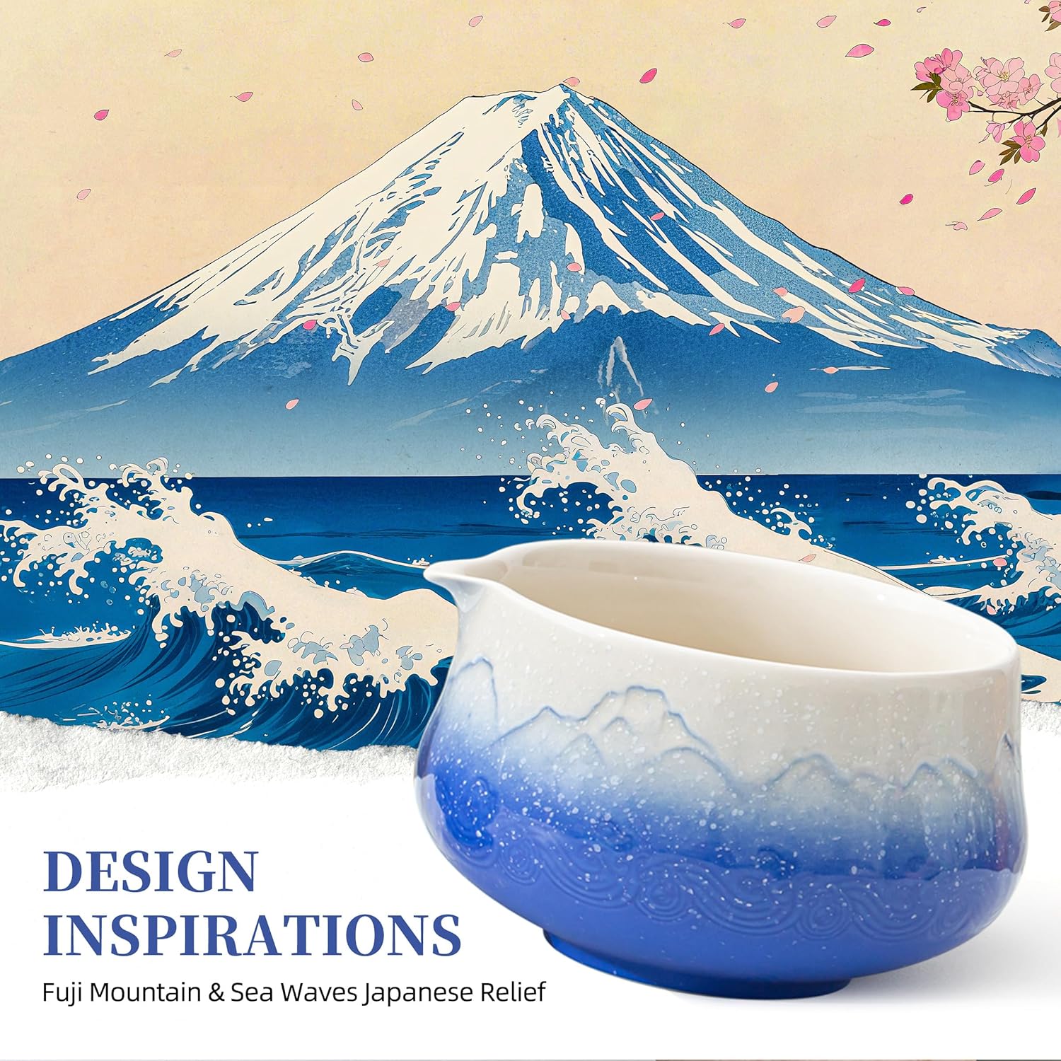 TEANAGOO 7 Pcs Matcha Whisk Set,Blue Matcha Set, Ceremony Matcha Powder Kit,Matcha Tea Set for Making Latte,Matcha Whisk Set and Bowl with Scoop&Sifter,Fuji Design Ceramic Bowl,Gift for Matcha Lovers