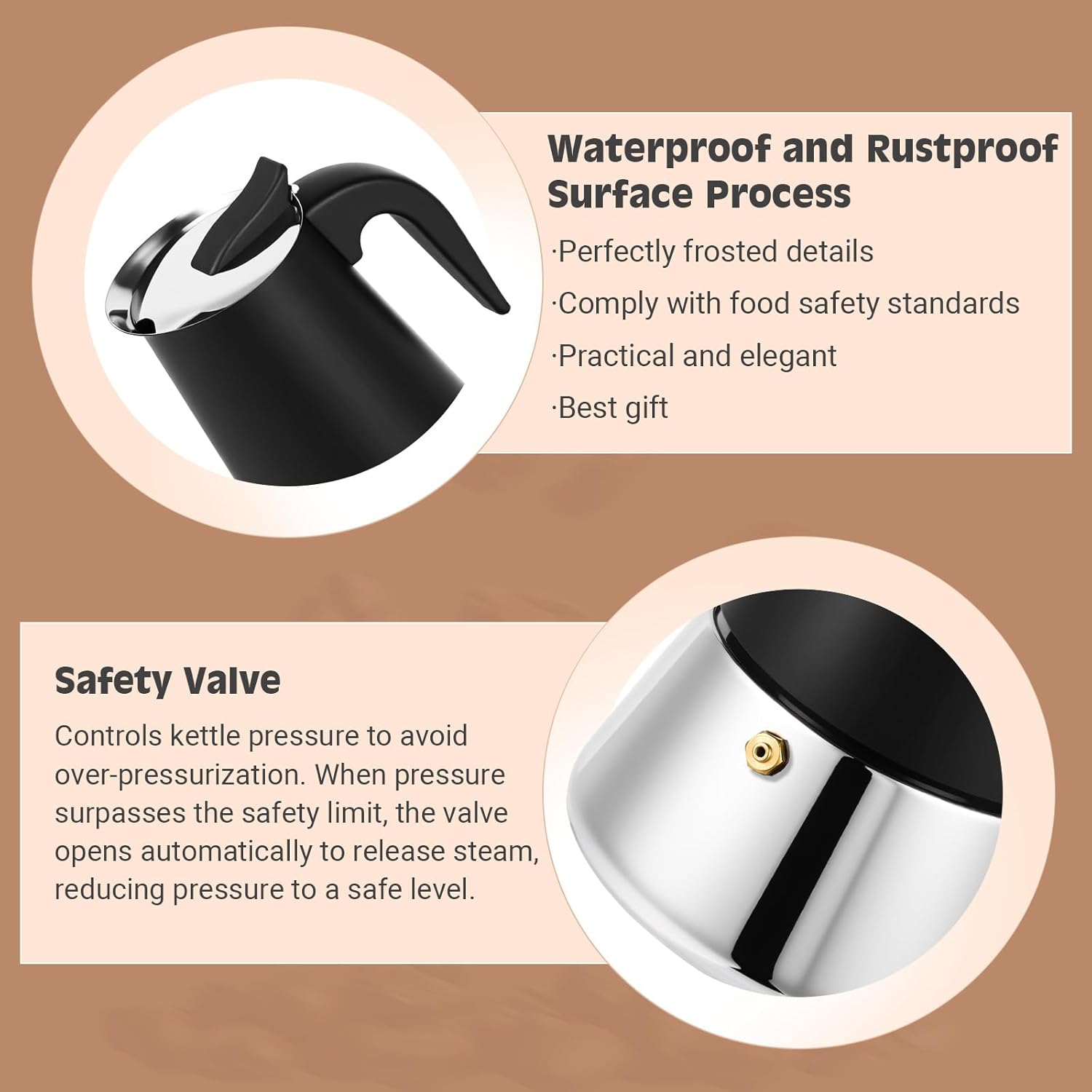 - HIGH-QUALITY 304 STAINLESS STEEL: Made of food-safe 304 stainless steel, compliant with EN13248. Our mocha pot resists coffee acids/scratches, retaining shine. The inner wall of the lower pot is sandblasted. Comes in gift-ready packaging