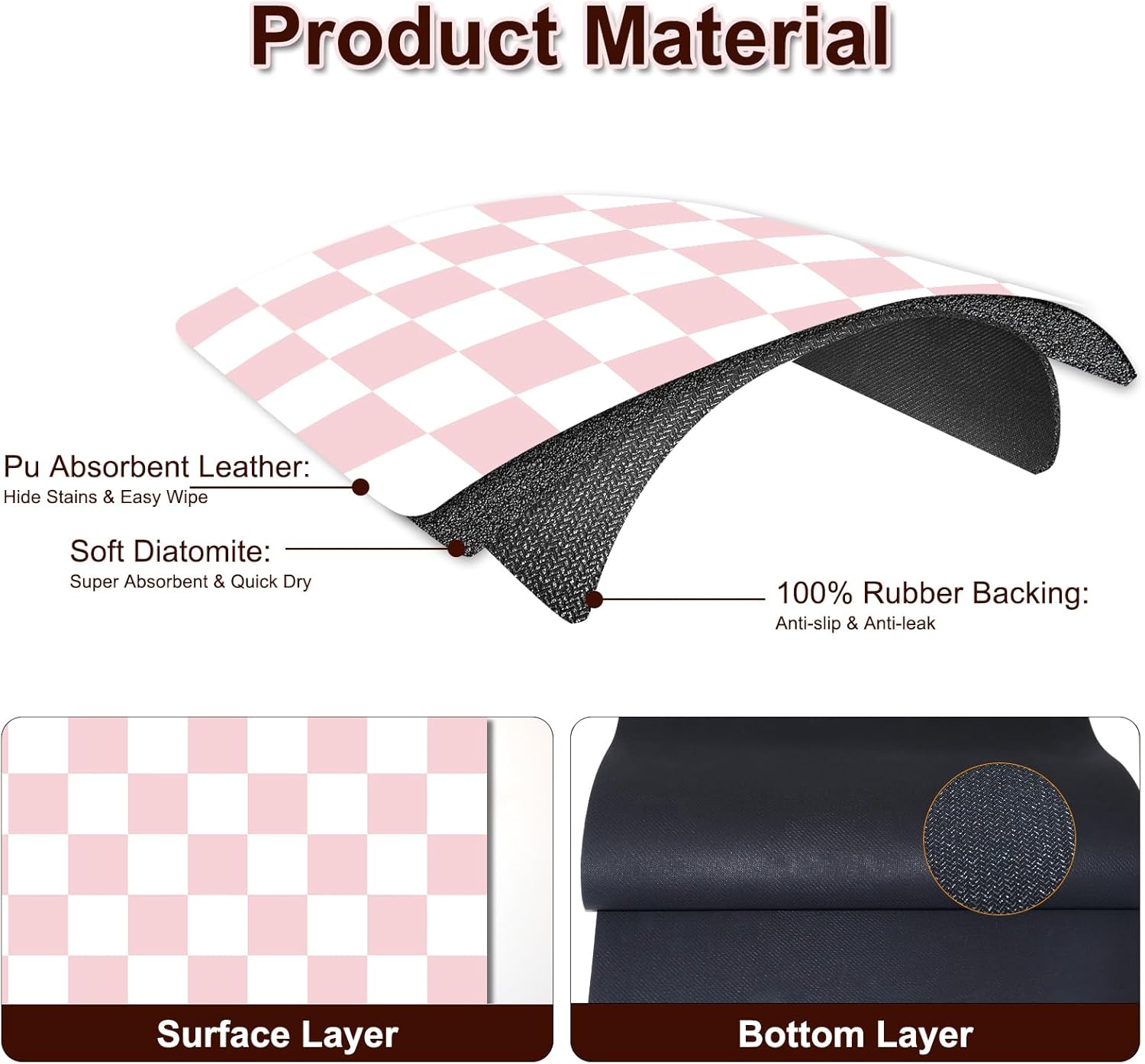 Dish Drying Mat for Kitchen, 15.7'' x 23.6'' Checkered Coffee Bar Mat for Countertops, Coffee Station Mat with Non-slip Rubber Backed, Absorbent Dish Dying Pat for Kitchen Counter, Pink & White