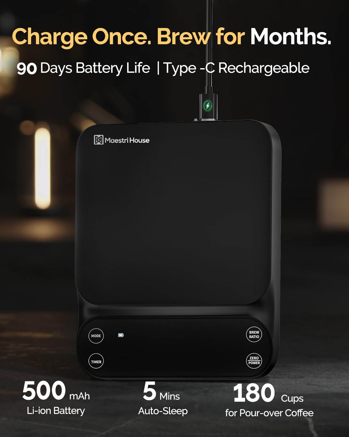 - 【Charge Once, Brew for Months】Stay eco-friendly and efficient with the built-in 500mAh lithium battery, offering up to 90 days of use on a single USB-C charge. This rechargeable espresso scale eliminates disposable batteries, keeping your coffee station clean, clutter-free, and ready for your next brew