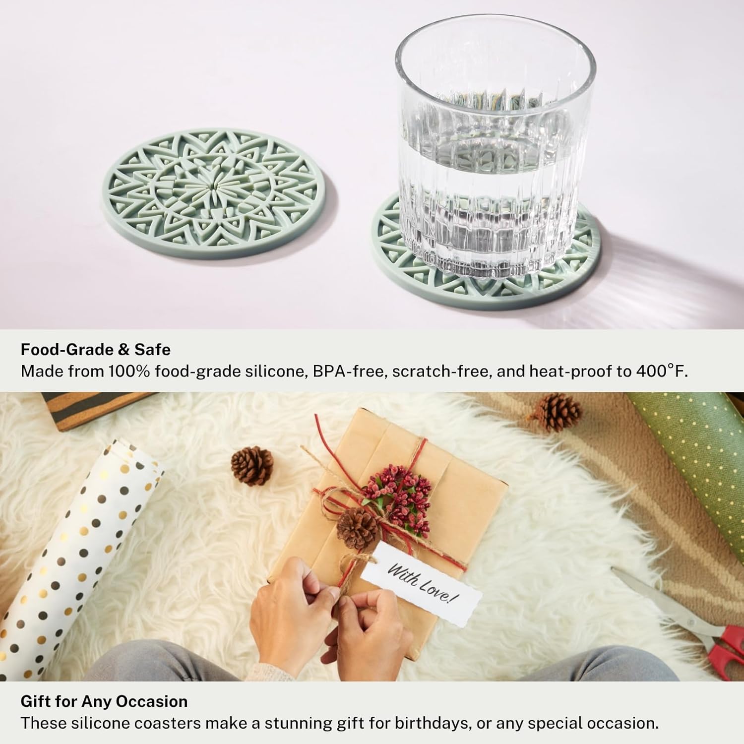 - Protect Your Tables – No more unsightly ring marks on your dining or coffee table. Our durable, non-slip silicone coasters provide reliable protection and keep your surfaces looking new.