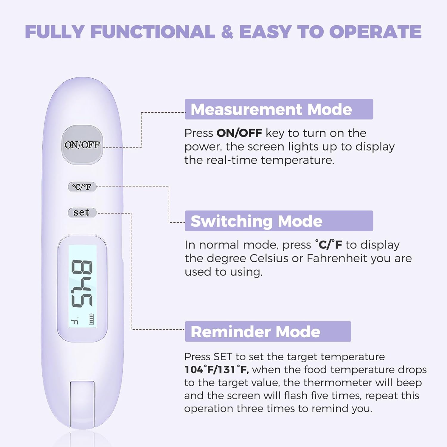 - Reminder Function | When the thermometer probe is inserted into food, you can set the target temperature to either 104°F (40°C) or 131.0°F (55°C). Once the food reaches the target temperature, the dispenser will beep and the backlit screen will flash five times to alert you.