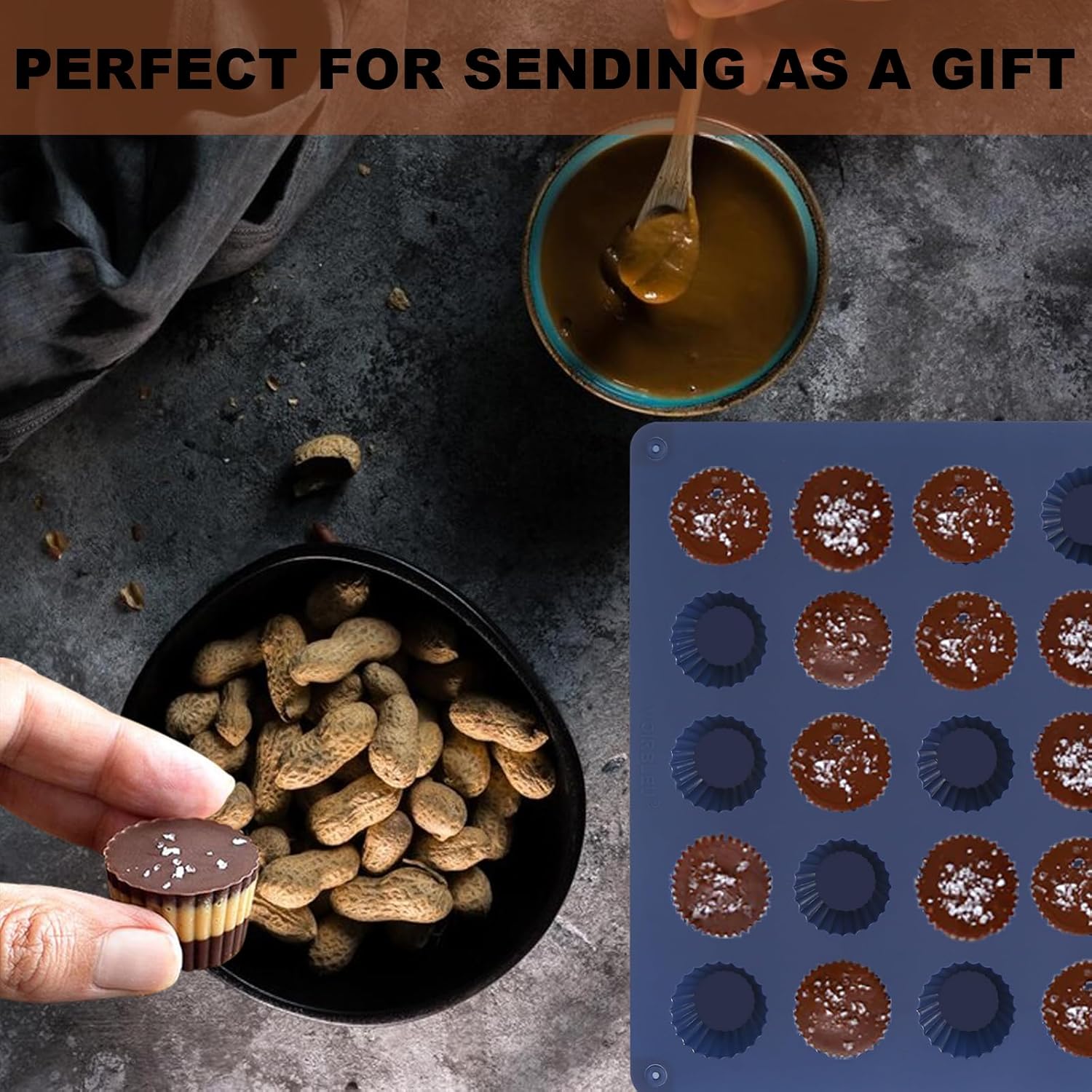 - The silicone peanut butter cup mold is made of 100% premium food grade silicone material which possesses non-stick polished surface for each cavity, easy to pop out. And its temperature resists from -40 to 230 degrees Celsius (-40℉to 440℉).