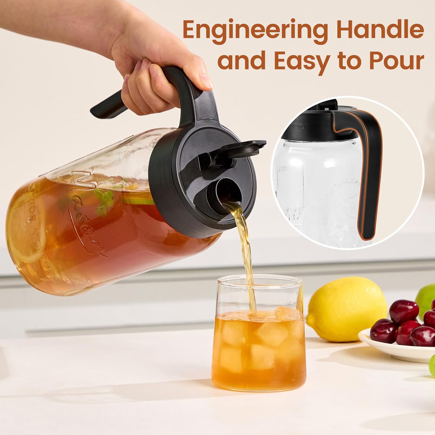 Mason Jar Pitcher with Tea Filter, Airtight & Leakproof Glass Pitcher with Lid, 64 oz Sun Tea Glass Jar for Outside, Perfect for Sun Tea, Lemonade, and iced Tea