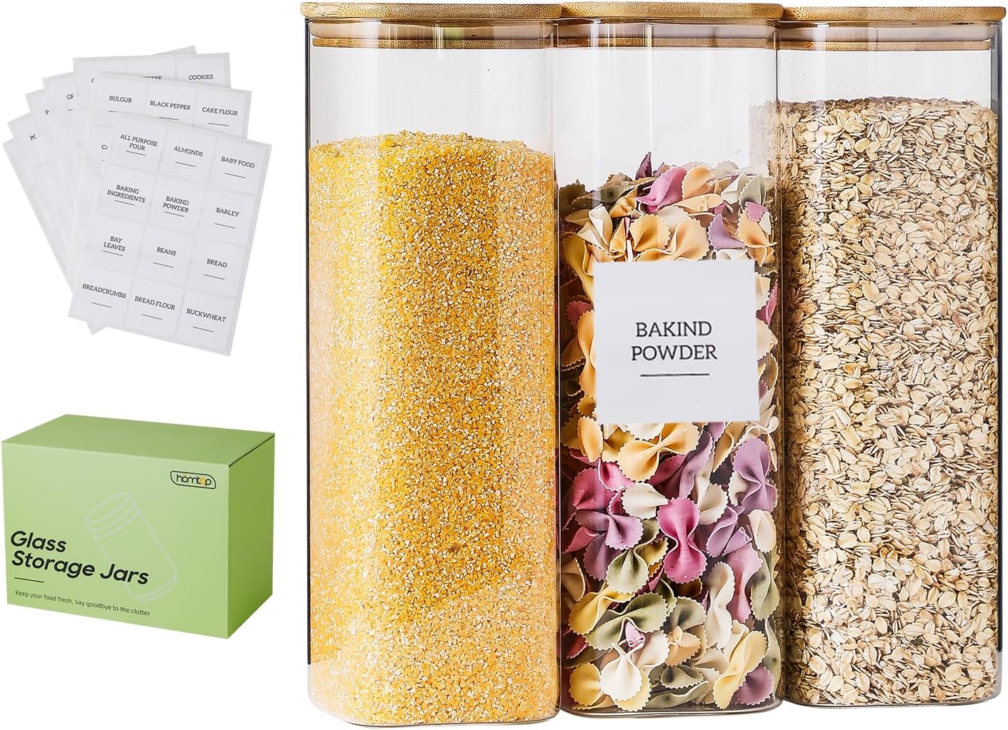 Glass Jars with Bamboo Lids 3 Pack, 74 Oz Airtight Square Storage Container, High Borosilicate Glass Kitchen Canisters for Soild food, Nuts/Cookies/Sugar/Pasta
