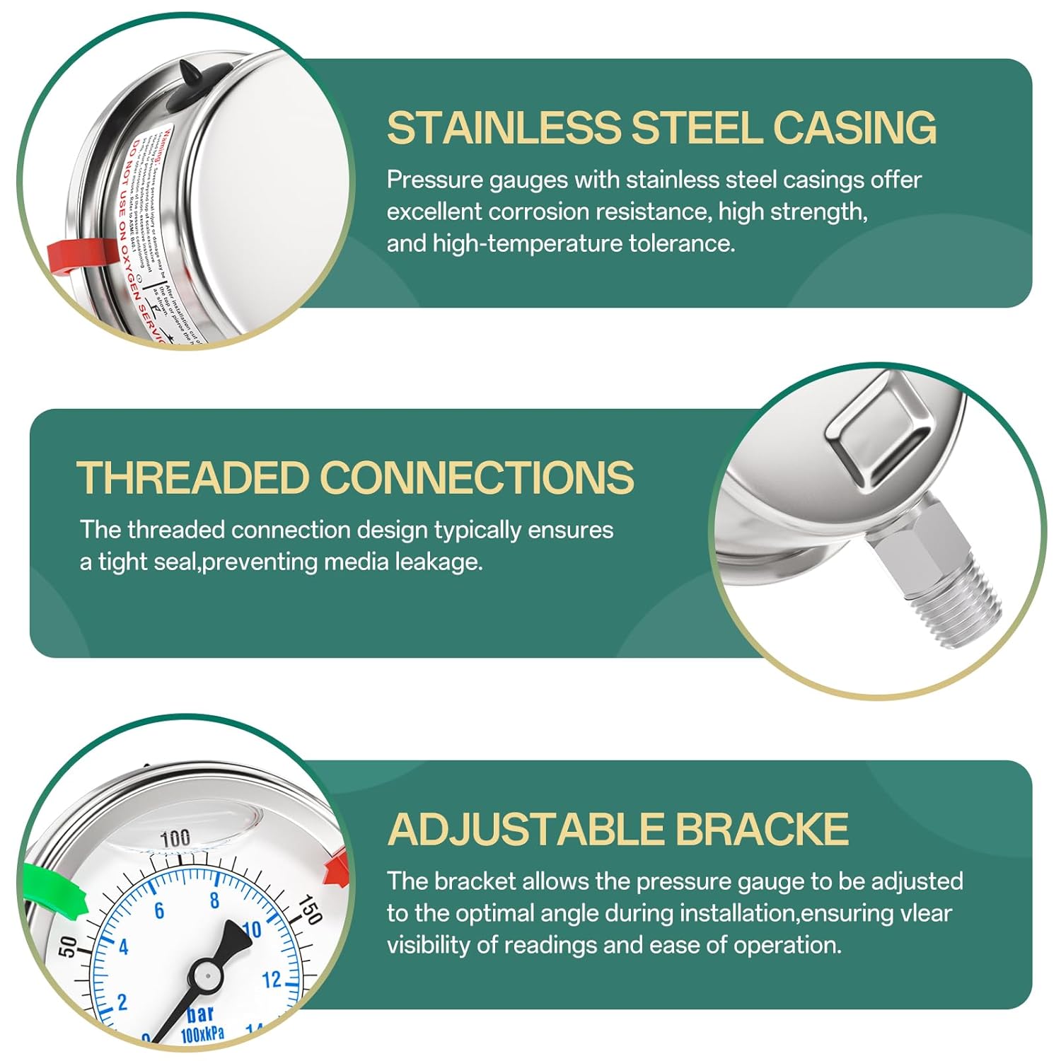 0-200PSI Stainless Steel Liquid Filled Pressure Gauge, 2.5" Dial Size, 1/4" NPT 316 Stainless Steel Joint, Lower Mount, for Tube, Water Pump, Gas, Liquid (with Range Mark Pointer)