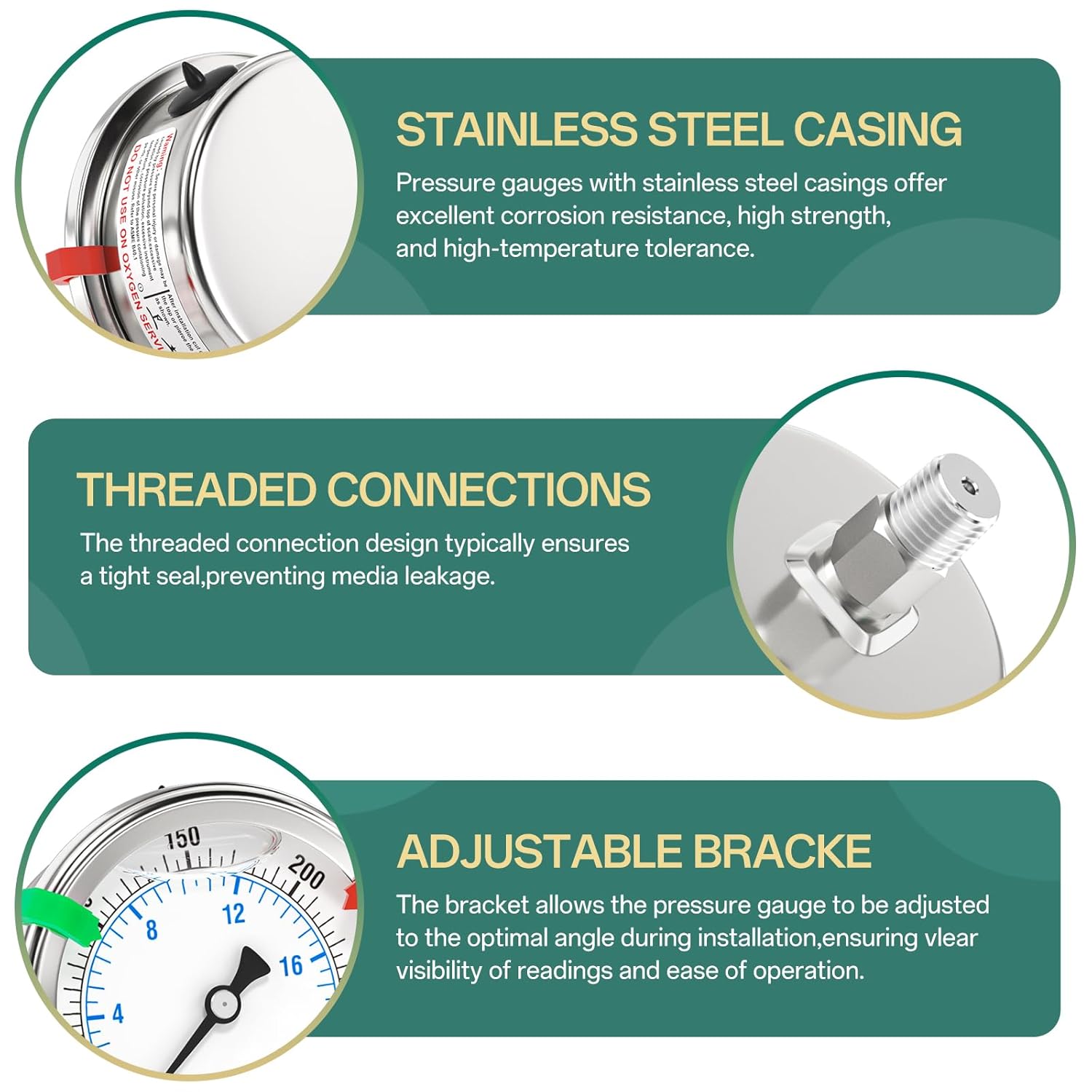 0-300PSI Stainless Steel Liquid Filled Pressure Gauge, 2.5" Dial Size, 1/4" NPT 316 Stainless Steel Joint, Back Mount, for Tube, Water Pump, Gas, Liquid (with Range Mark Pointer)