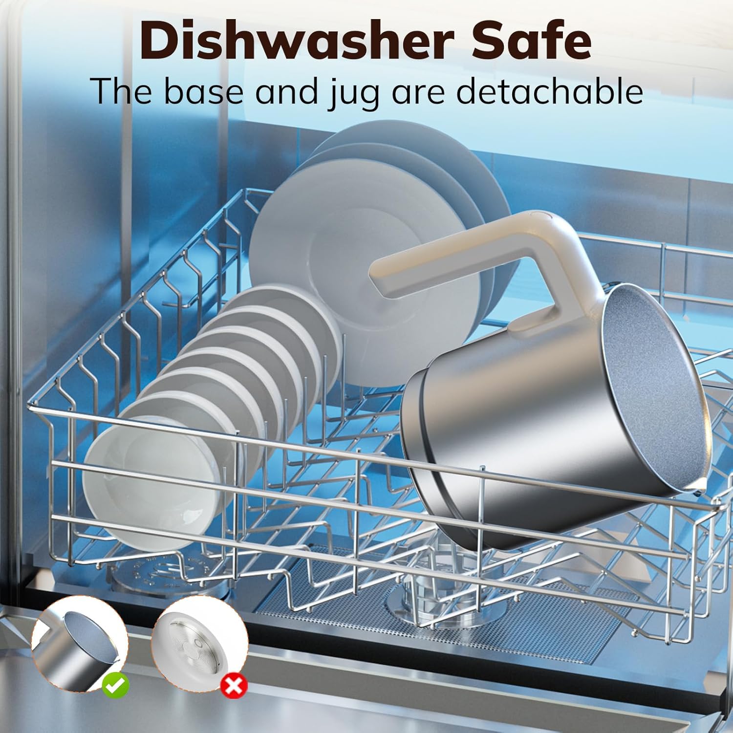 - Our electric milk frother features a split design, making cleaning a breeze. Unlike many non-detachable milk frother, ours is dishwasher safe for added convenience. To ensure optimal performance, please wipe off water stains from the base of the milk jug after each cleaning.
