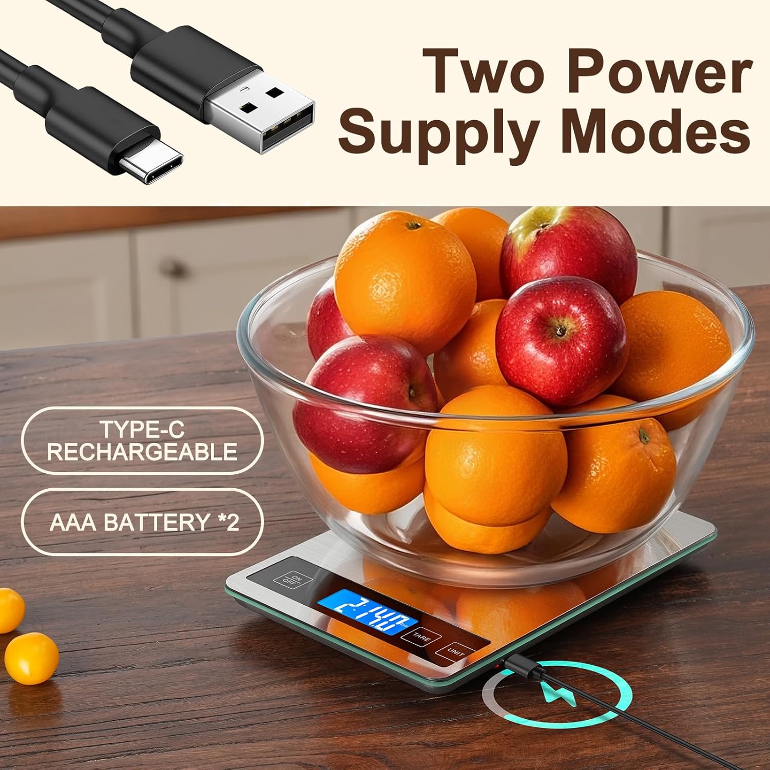 - [ Dual Power Supply ]: This food scale contains a built-in lithium battery that can be charged via a USB cable, you can also use AAA batteries. Accessories: USB cable, AAA battery*2