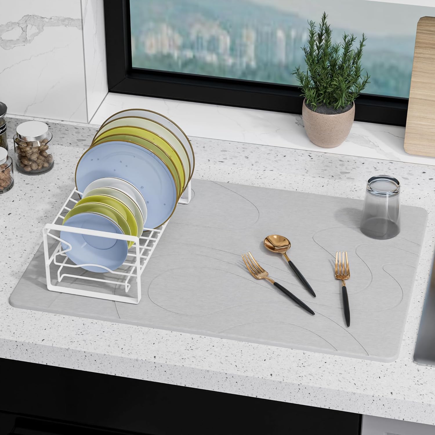 Large Stone Drying Mat for Kitchen Counter, 24" × 16" Diatomite Dish Drying Mat, Quick Dry Stone Mats, Ultra Absorbent Natural Diatomaceous Earth Mats for Dished, Bottles, Light Grey