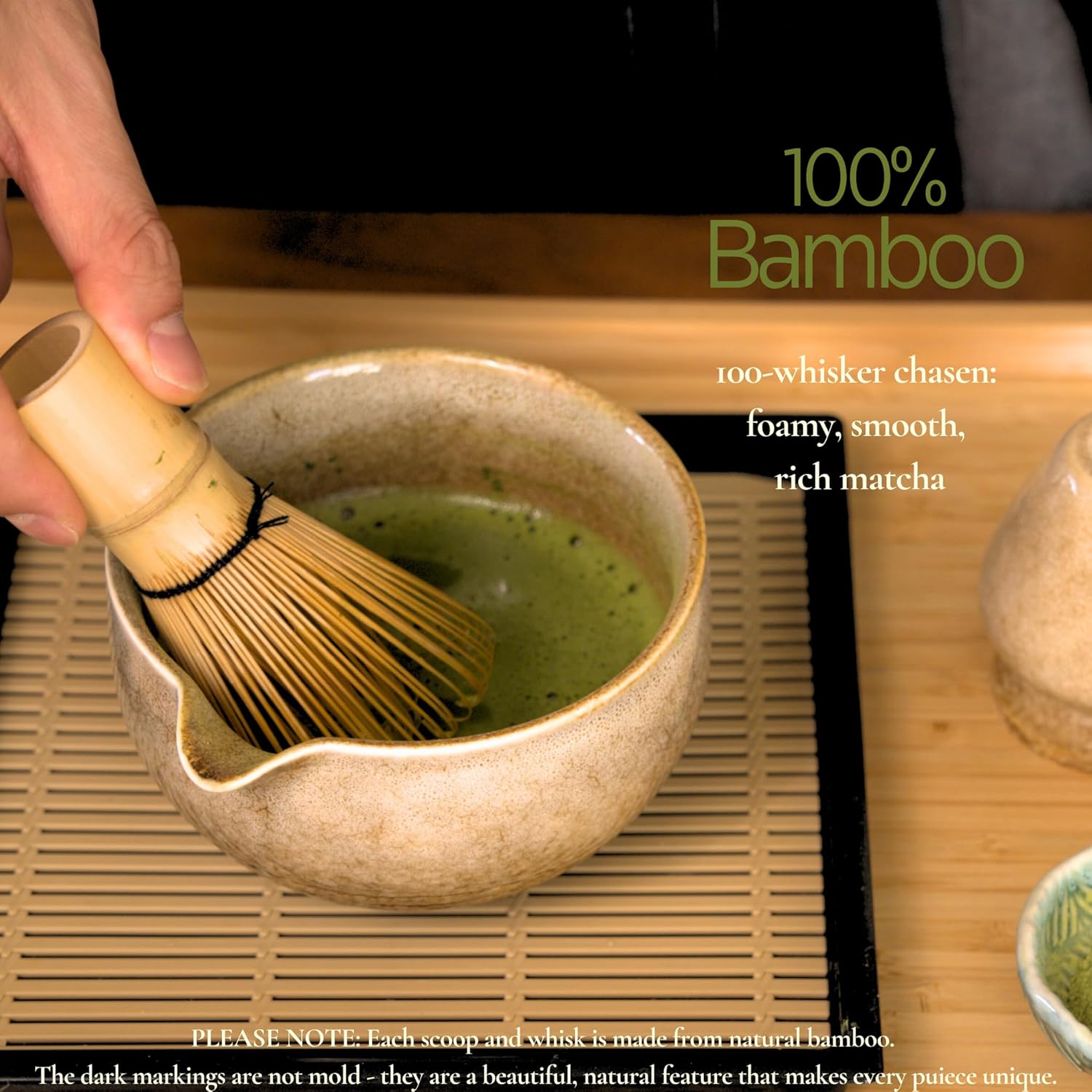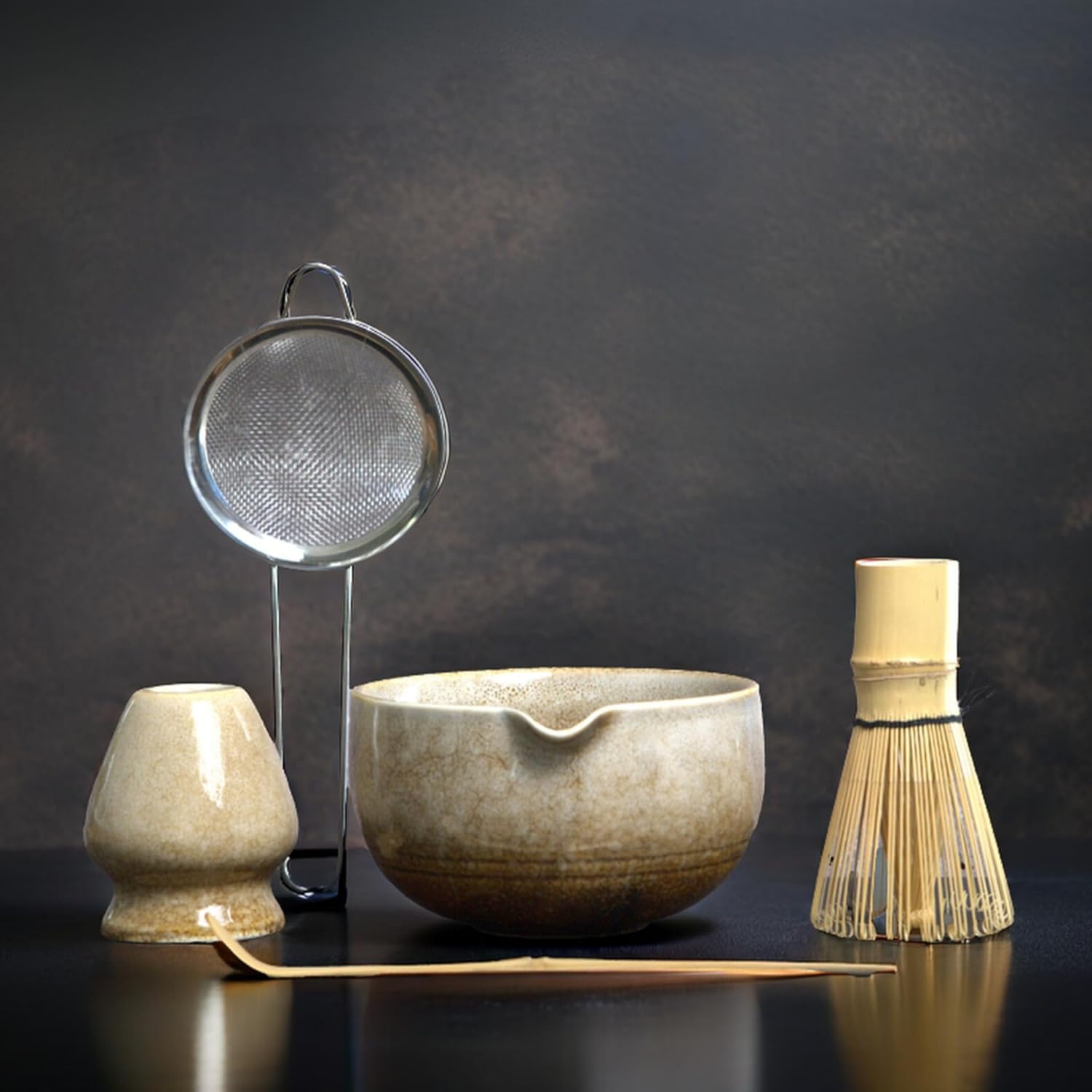 - 🧘♀️【Your Daily Matcha Ritual, All in One Set】 This 5-piece matcha tea set has everything you need to create smooth, café-style matcha at home—whether you’re a daily drinker, just getting started, or curious about traditional Japanese tea rituals. Includes: 1× Matcha Bowl with spout, 1× Bamboo Whisk (Chasen), 1× Whisk Holder, 1× Bamboo Scoop (Chashaku), 1× Stainless Steel Sifter.