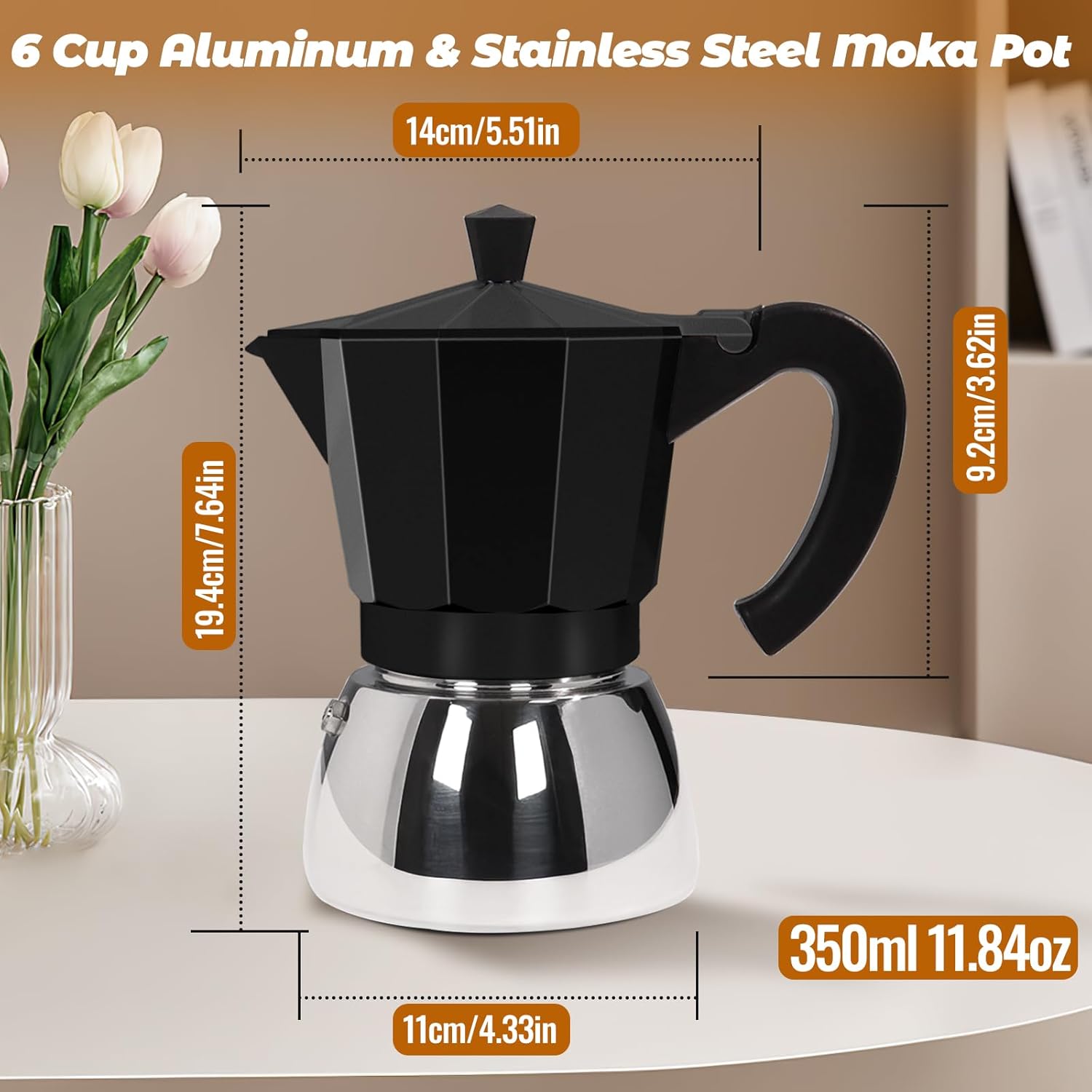 No Coating 6 Cup Aluminum and Stainless Steel Moka Pot Stovetop Espresso Maker Italian Coffee Machine 350ml 11.84oz Suitable for Gas Induction Stovetop Greca Coffee Maker Percolator Black